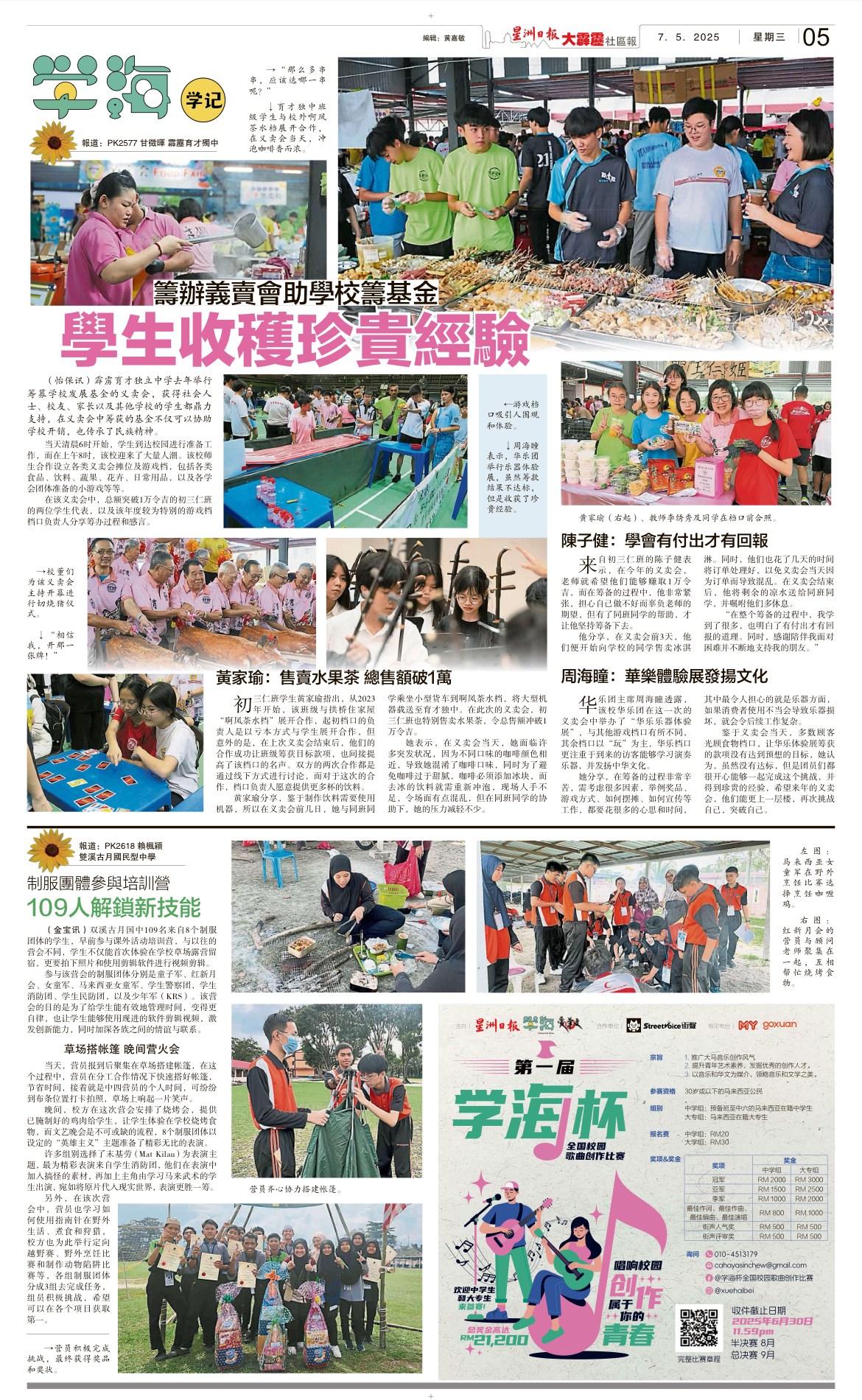 本校甘征晖同学(高二理)去年(2024年)加入《星洲日报》成为“学海学记”,这次的“义卖会”报道被刊登在2025年5月7日的《星洲日报大霹雳》。之前他还有“专访本校运动员”以及“家长日”的报道被刊登。