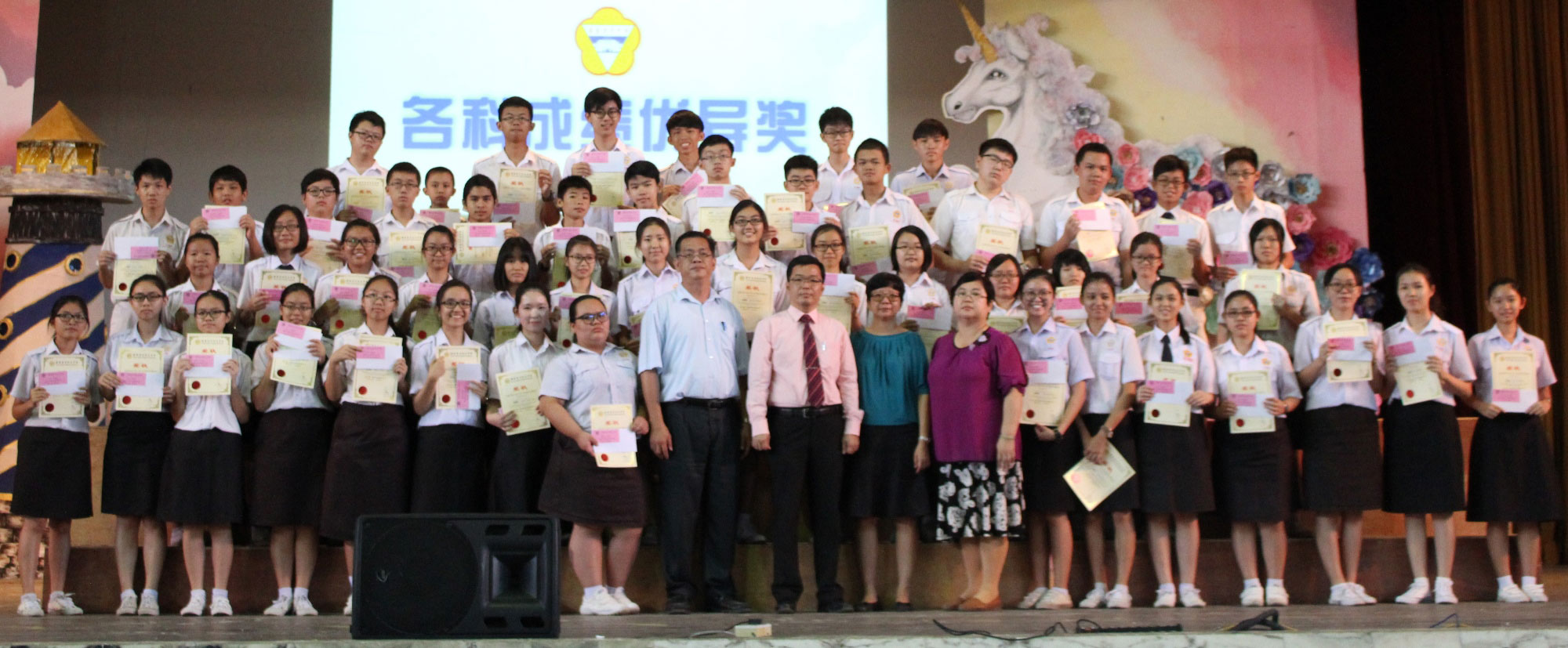 谢志明副校长(前排左九起)、苏民胜校长、陈美云副校长和教务主任蔡秀芳与各科成绩优异奖得奖者合照。