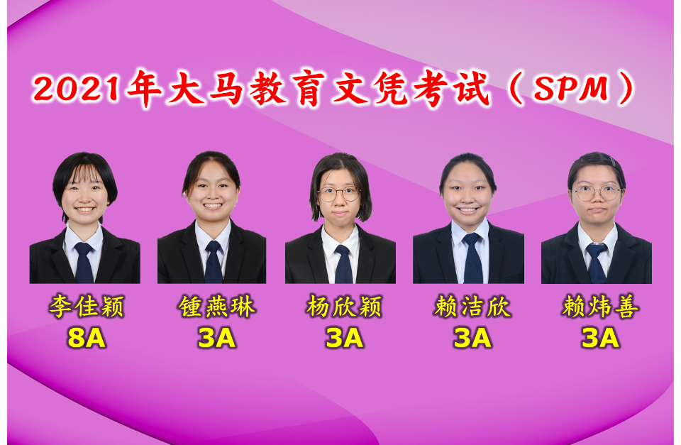 本校共有27名学生报考 SPM,5位学生考获3A及以上的佳绩,其中李佳颖考获全科8A;锺燕琳、赖洁欣、赖炜善和杨欣颖考获3A。