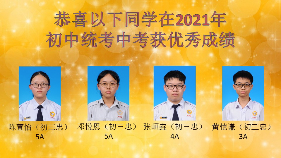 2021年第47届全国独中统一考试(统考)于2022年3月23日放榜,本校共有10名初中考生考获3科A以上,其中2人考获8A的佳绩。