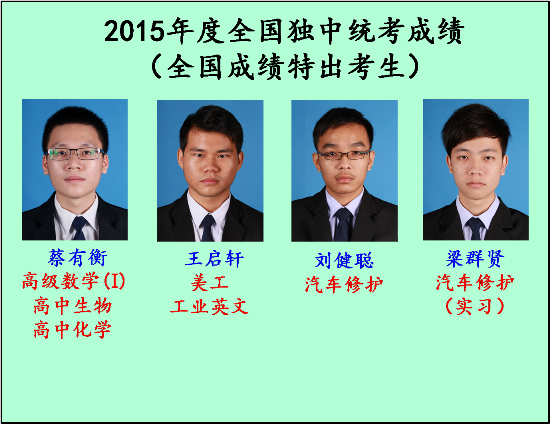 另外,本校的文美科和汽车维修科考生也考获不俗的成绩。文美科考生在高中美术和美工(实习)2个科目中考获100%及格率;汽车维修科考生则在英文、数学、高级数学、汽车修护(实习)等4个科目中考获100%及格率。文美科考生王启轩也考获8科A的佳绩,同时也荣膺美工、工业英文两科全国特出考生;周国进、丘育康、黄庭峰和黄嘉宁等4名考生也荣膺美工实习科全国特出考生。汽车维修科的刘建聪荣膺汽车修护科全国特出考生,梁群贤则荣膺汽车修护(实习)科全国特出考生。