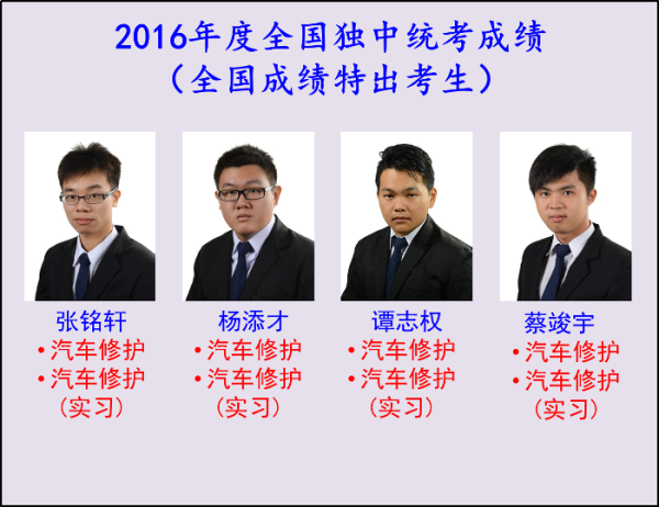 而汽修班的谭志权考获3科A,并且荣膺汽车修护及汽车修护(实习)全国特出考生。此外,荣膺汽车修护及汽车修护(实习)全国特出考生的汽修班学生有张铭轩、蔡竣宇、杨添才,而荣获汽车修护(实习)全国特出考生的还有张晋民、冼威瀚及林颖雄。