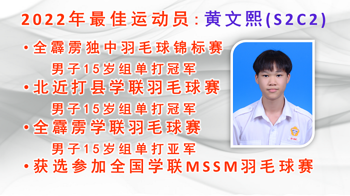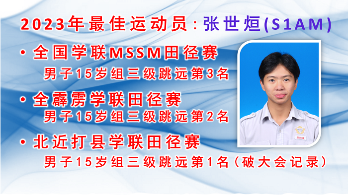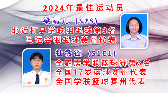 2022年、2023年、2024年最佳运动员 本校于学校假期前最后一天(2024年12月10日)举行颁奖暨结业典礼,表扬及肯定学生在2024年的优良表现,其中包括体育处颁奖给2022年、2023年和2024年的最佳运动员。