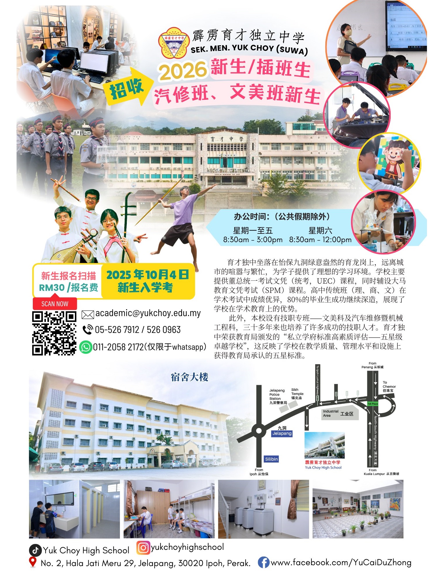 2026年度新生与插班生招生 本校2026年度初一新生及高中技职科插班生报名现正开放! 育才独中创校逾百年,秉持“礼义廉耻”的校训,致力于培育学生健全品格与正向人格,提供优质、多元的学习环境,发掘并培育学生潜能,培养德、智、体、群、美全面发展的未来栋梁。 本校拥有资深稳健的师资团队与完善的课程规划,重视学术与技职并重的发展方向,鼓励学生在课业与课外活动中发挥所长,积极参与语文、艺术、体育等各类竞赛及项目,并透过丰富的校园活动,全方位提升综合素质与实践能力。 校园环境优美,设备完善,是学生安心学习、茁壮成长的理想园地。诚邀有志加入育才大家庭的莘莘学子踊跃报名! 【初一新生入学考试】 日期:2025年10月4日(星期六) 报名费:RM30 报名链接:https://forms.gle/ca45pbrjCLomt5AR7 /扫描二维码 洽询电话:05 – 526 7912(教务处) 办公时间:周一至周五 8:00AM – 4:00PM|周六 8:00AM – 1:00PM(公共假期除外) Illustration and Design Contest for Essay Compilation 2025