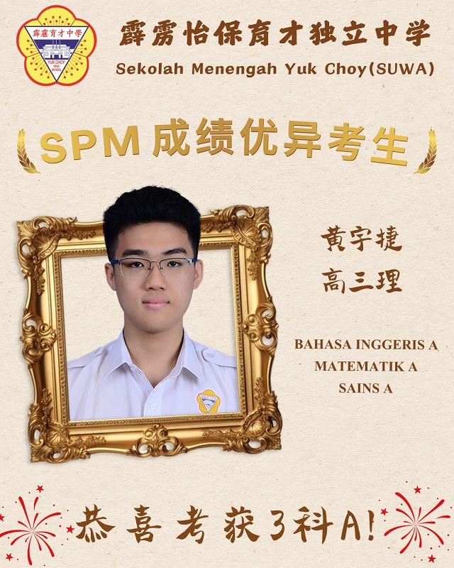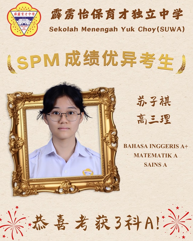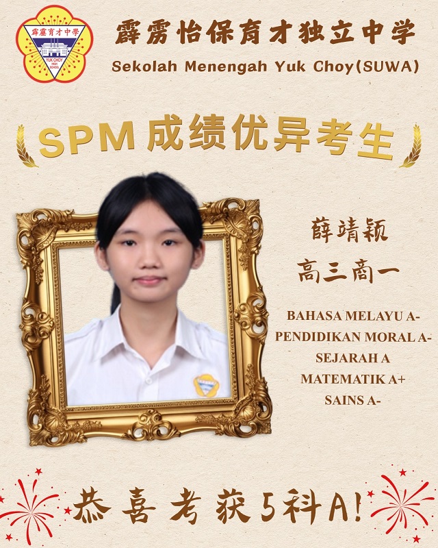 2025年SPM成绩放榜 2026年4月3日发布 2025年SPM成绩日前揭晓,本校共有5个科目的及格率达到90%以上,分别为华文(97.5%)、国文(97.5%)、英文(100%)、数学(92.5%)及科学(95%)。整体成绩稳中有进,不仅展现出本校学生在语文科方面的扎实基础,也反映出理科领域良好的学习成效与稳定表现。 值得一提的是,本校共有3名同学考获3A及以上的优异成绩,分别为荣获5A的薛靖颖(高三商一),以及荣获3A的苏子祺(高三理)和黄宇捷(高三理),表现令人欣慰。 近年来,本校积极鼓励学生报考SPM考试,为未来升学与发展开拓更广阔的道路。为此,考生们在备考期间,利用每逢双周休的星期六返校参与补习课程,在兼顾独中课程的同时,全力投入SPM的学习与准备,展现出高度的自律与坚持。 此次成绩不仅凝聚了同学们的努力与付出,也离不开教师们的悉心指导与家长们的支持与配合。期望同学们再接再厉,在未来的学习道路上不断突破自我,迈向更高的目标。 文轩书苑书展