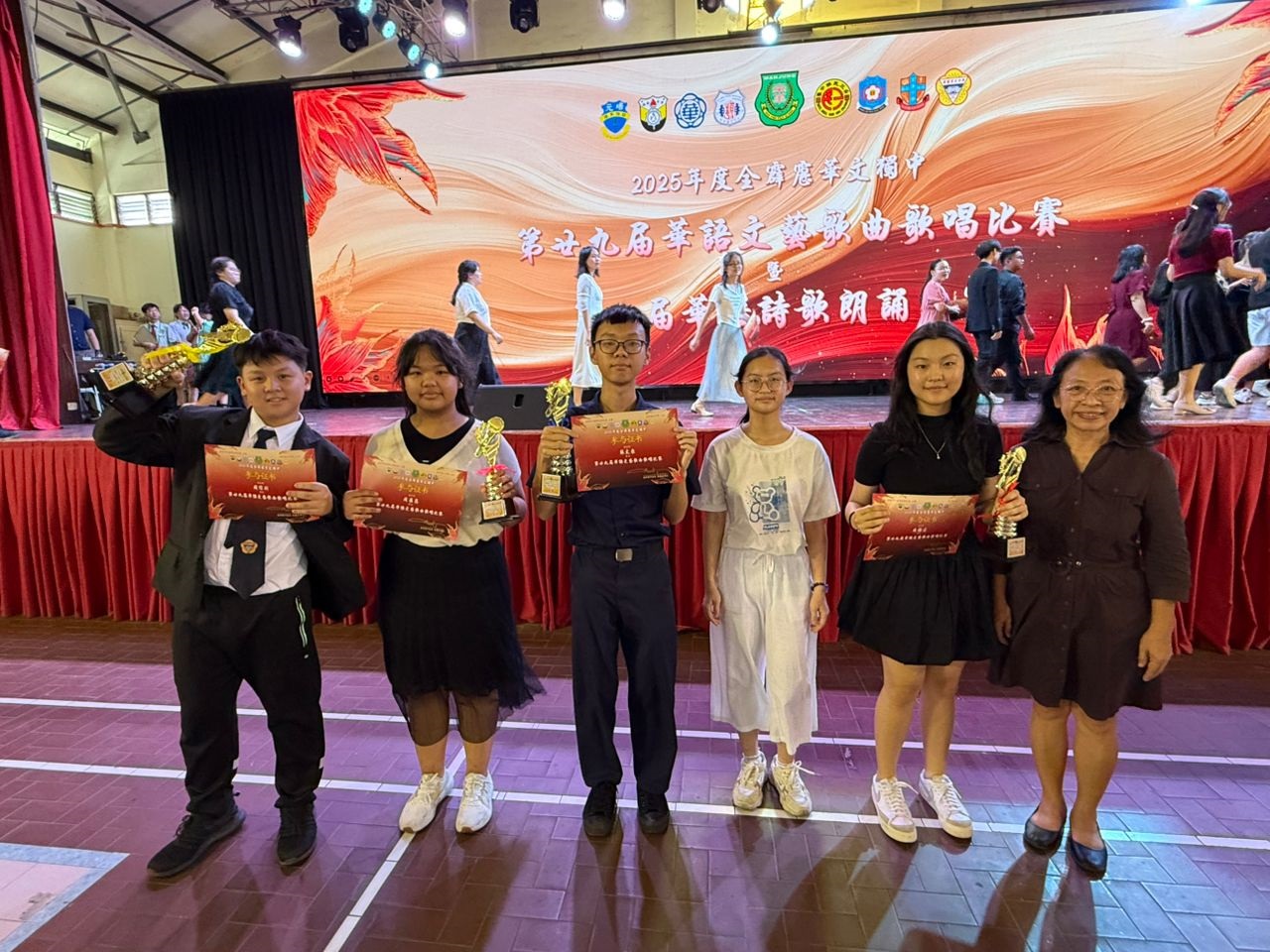 摄影:黄旖馨(高一理)、冯悦莹(初二忠) 2025年全霹雳华文独中第8届华语诗歌朗诵比赛:初中组冠军、高中组季军、第29届华语文艺歌曲歌唱比赛:初中男生组冠军、女生组优胜奖、高中男生组亚军、女生组优胜奖