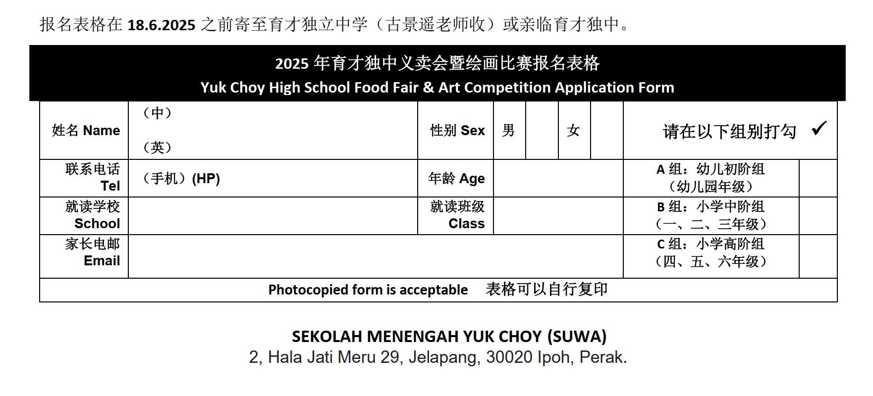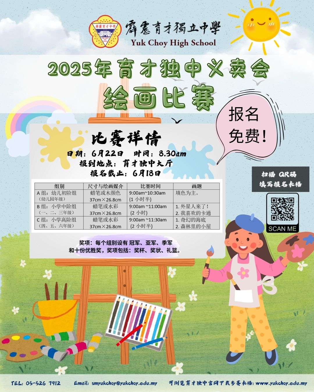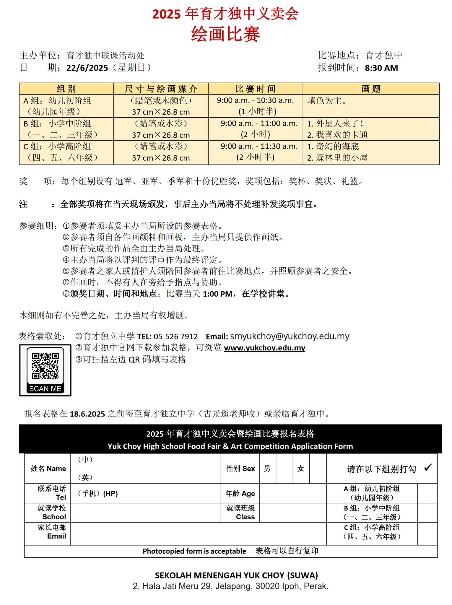 吃喝玩乐全都有,还能免费赢奖品?没错!趁着义卖会热闹登场,活动处特别举办“绘画比赛”,邀请幼儿园生和小学生挥动画笔,为义卖会添上缤纷色彩,热闹加倍、快乐加倍! 欢迎有兴趣的家长扫码或点击下方链接填写报名表格,一起参与这场充满爱与欢乐的盛会! 更多资讯,请参考报名表或拨打热线洽询。6月22日,等你来High翻义卖会! 报名链接:https://forms.gle/w1nQergn6cE2xBqn8 洽询热线:05 – 526 7912(请洽“活动处”) 育才独中义卖会6月22日举行