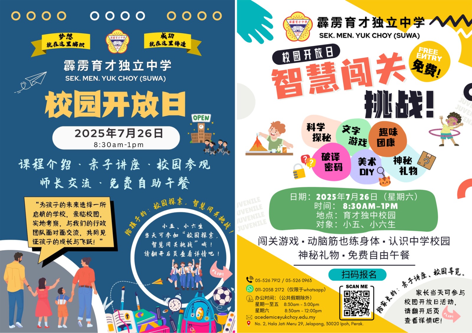 育才独中7月26日举办校园开放日 欢迎小五、小六生与家长踊跃参与 2025年5月12日发布 为了让家长与学生更全面了解本校的教学理念与校园环境,本校将于2025年7月26日(星期六)上午8时30分至下午1时,举办一年一度的校园开放日活动,诚邀小五、小六年级学生及其家长/监护人踊跃出席。 此次开放日内容丰富,涵盖课程介绍、亲子讲座、校园参观、师长交流等环节,让参与者深入了解本校课程设置、教育方针及软硬体设施。此外,活动当天也将免费提供自助午餐,方便家长与学生轻松参与、交流互动。 开放日不仅是探索孩子未来学习环境的良机,也让家长能与校方师长面对面交流,获取第一手的入学资讯与教育规划建议。 另外,活动将采取先到先得的方式报名,报名截止日期为2025年7月5日(星期六)。如需更多详情或有任何疑问,欢迎致电或亲洽本校宣教处查询(05 – 526 7912)。 此外,本校董事也将出席此活动与家长们交流。 2025年育才独中义卖会绘画比赛:简章和报名表格