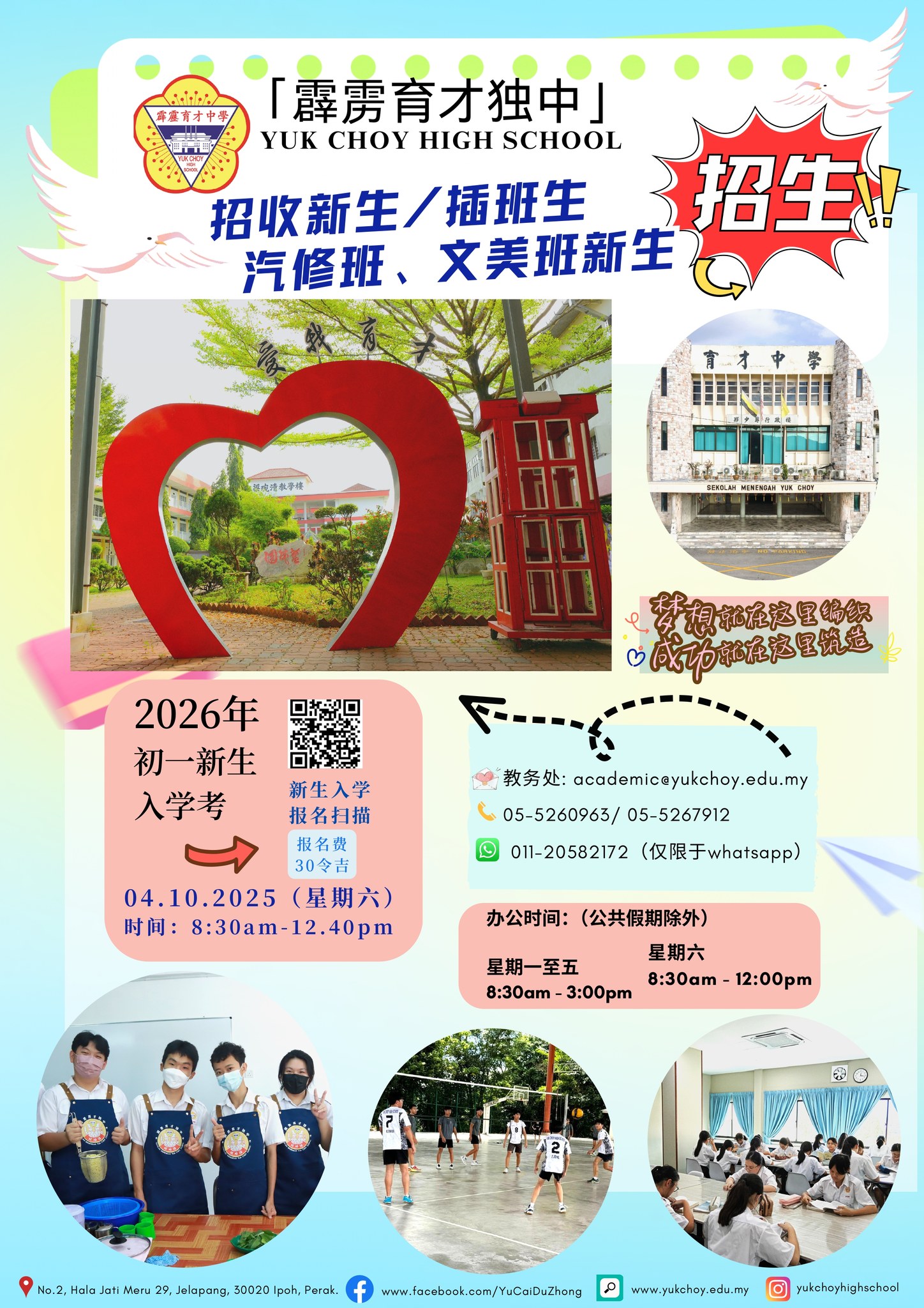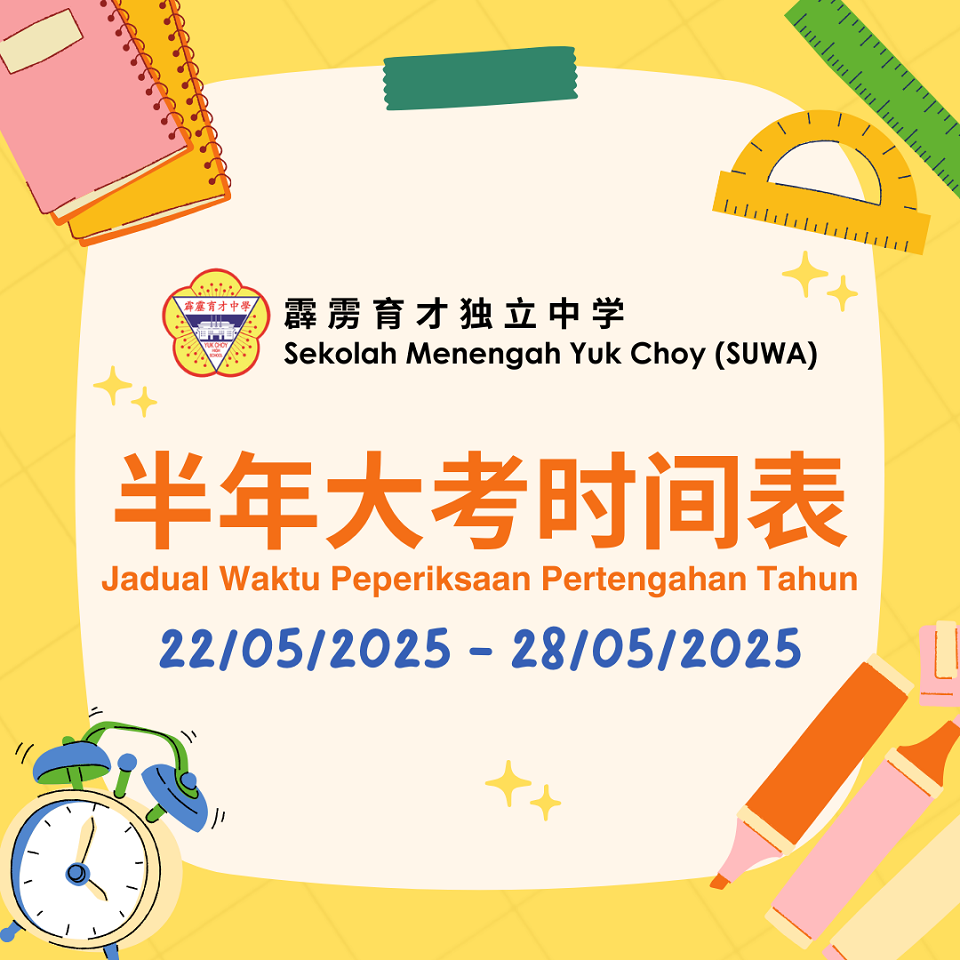 2026年度招生启动啦! 叮咚!通往2026年度初一班级的列车已就位,你准备好就座了吗? 一场精彩纷呈的成长之旅正等待着孩子们启程。在这段旅途中,他们将亲手绘出属于自己的人生蓝图。这里环境优美,是启航梦想的理想校园。在探索中,他们将结识志同道合的伙伴,遇见循循善诱的师长,点亮前行的方向。 无论是学术学习、体育锻炼、才艺发展,还是联课活动与社交技能的培养,都是他们一路收获的闪亮“徽章”。我们诚挚邀请你加入这个温暖且充满活力的大家庭,让梦想在这里扬帆起航! 校园环境优越,师资雄厚,设施完善 招收对象:2026年度初一新生、高中技职科插班生 洽询热线:05 – 526 7912(请洽“教务处”) 办公时间:周一至周五 8:00 AM – 4:00 PM|周六 8:00 AM – 1:00 PM(公共假期除外) 【2025年5月22日-5月28日】半年大考时间表