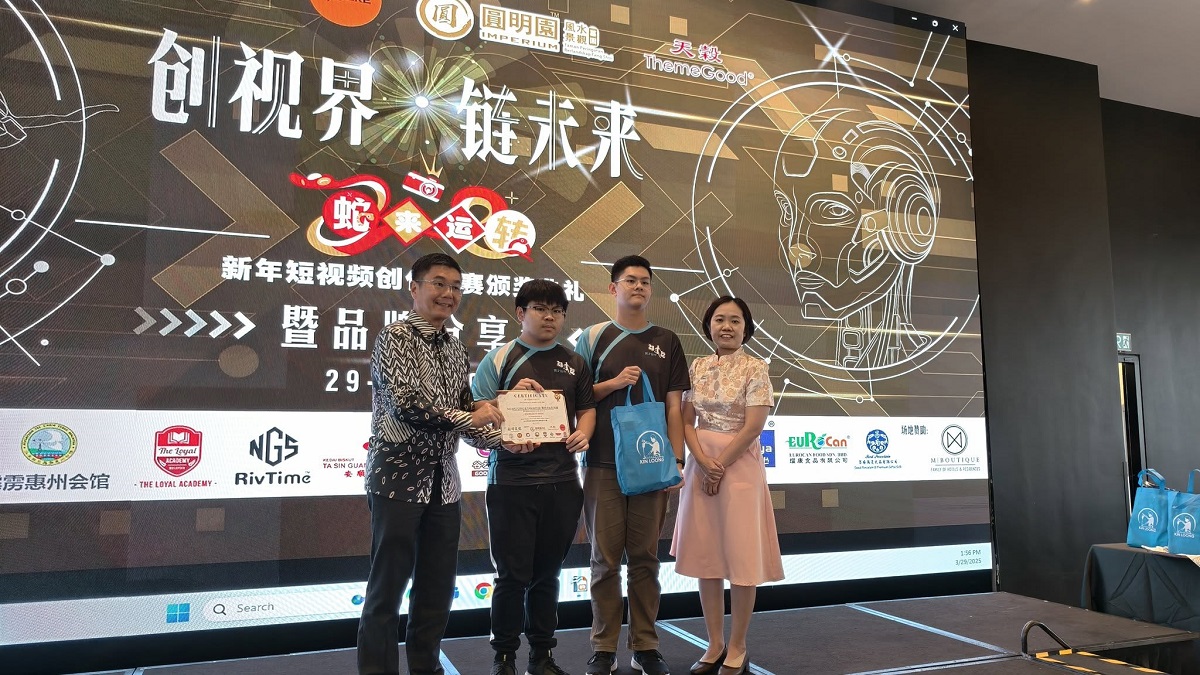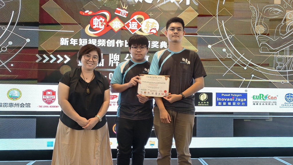 黄玮庆和陈玮捷参加2025年“蛇来运转”新年短视频创作比赛 获得优秀奖 【 蛇 来 运 转,“影” 出 精 彩 】 本校编辑学会会员的黄玮庆同学和陈玮捷同学(皆高三理)参加由《南洋商报》主办的 2025 年“蛇来运转”新年短视频创作比赛,凭借创意与实力脱颖而出,勇夺学生组优秀奖! 日前,在吴鄢如老师的带领下,同学们一同出席颁奖典礼,为这段光辉旅程画上完美句点。