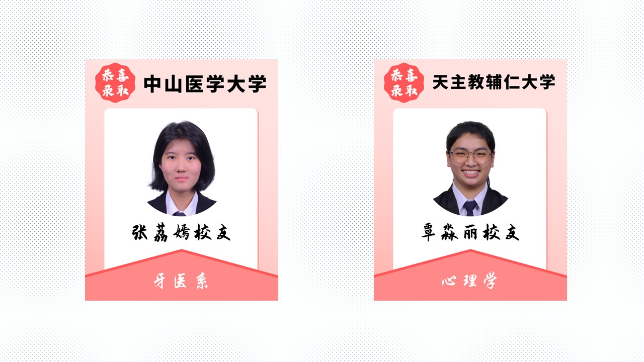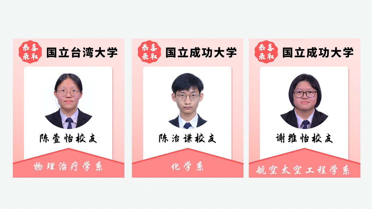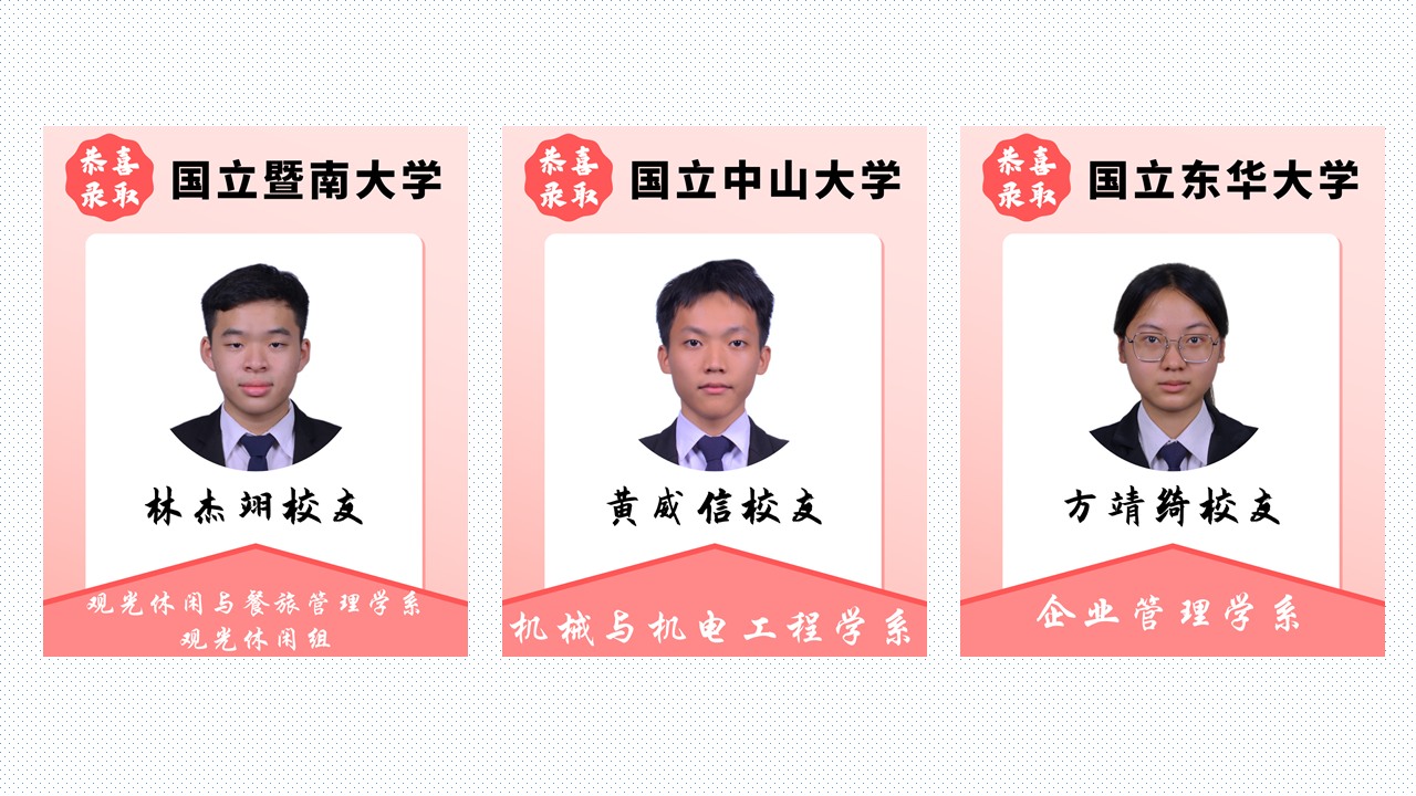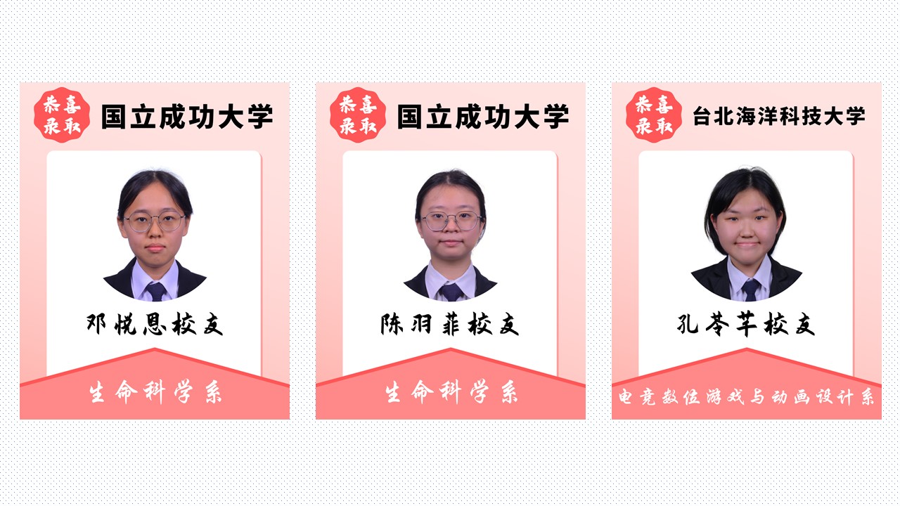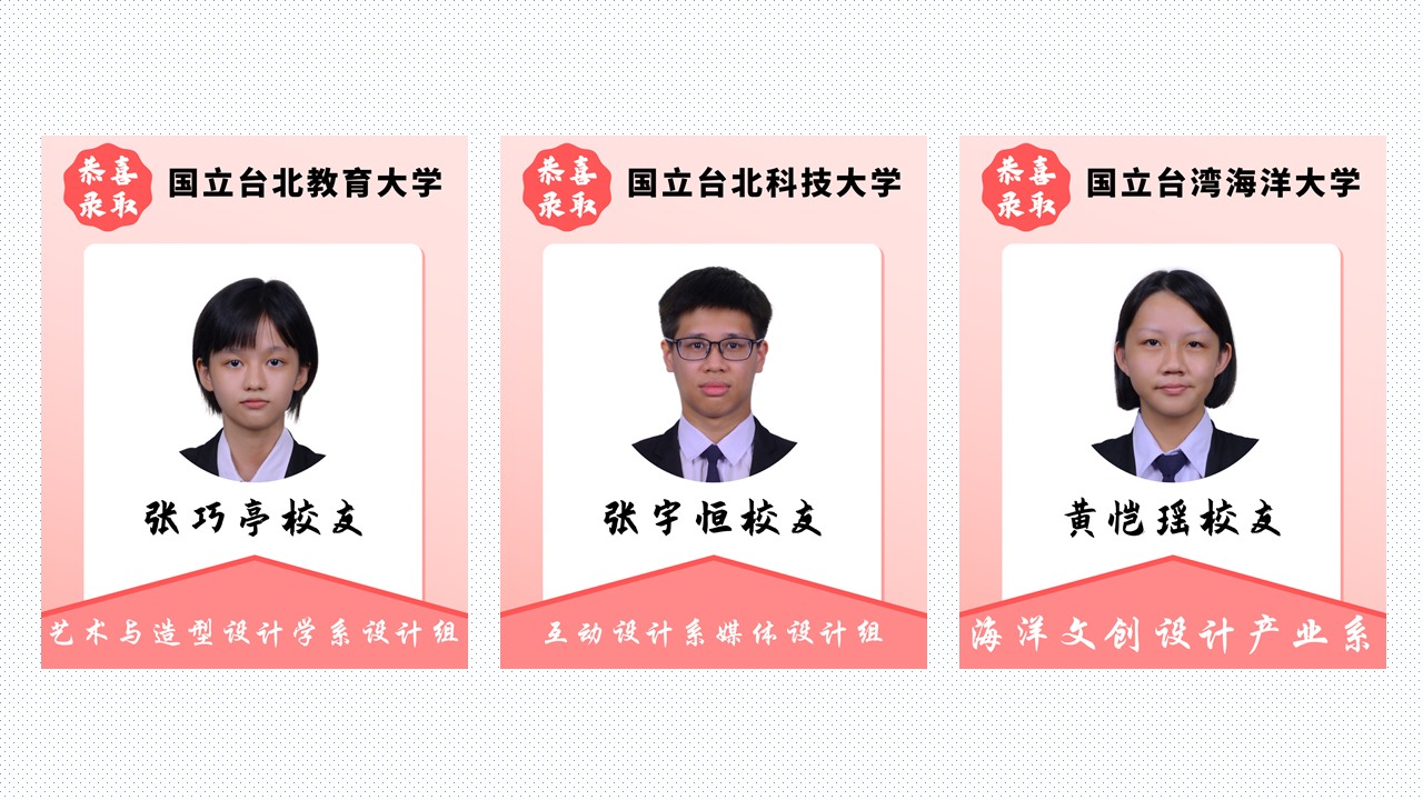 扬帆远航追梦路,书写青春好前途 2025年4月18日发布 恭喜本校多位毕业校友荣获台湾大学录取!衷心祝福你们在即将展开的大学生活中,收获精彩、充实无悔,绽放属于自己的光芒! 校内教享悦 2.0