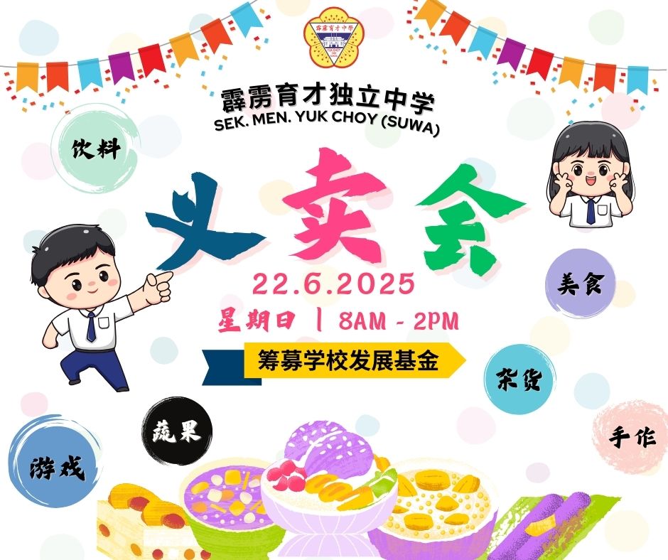 本校6月22日举办义卖会 师生们积极投入筹备于征求工作 2025年4月22日发布 为筹募发展基金,本校将于6月22日举办校园义卖会。师生们正积极投入筹备与征求工作,齐心协力,为活动倾注满满的热情与心血。诚挚邀请社会大众踊跃捐赠物品或款项,共同为独中教育的发展与校园建设献上一份力量! 洽询热线:05 – 526 7912(请洽“活动处”) 办公时间:周一至周五 8:00 AM – 4:00 PM|周六 8:00 AM – 1:00 PM|公共假期除外 2025年度学长团常年大会