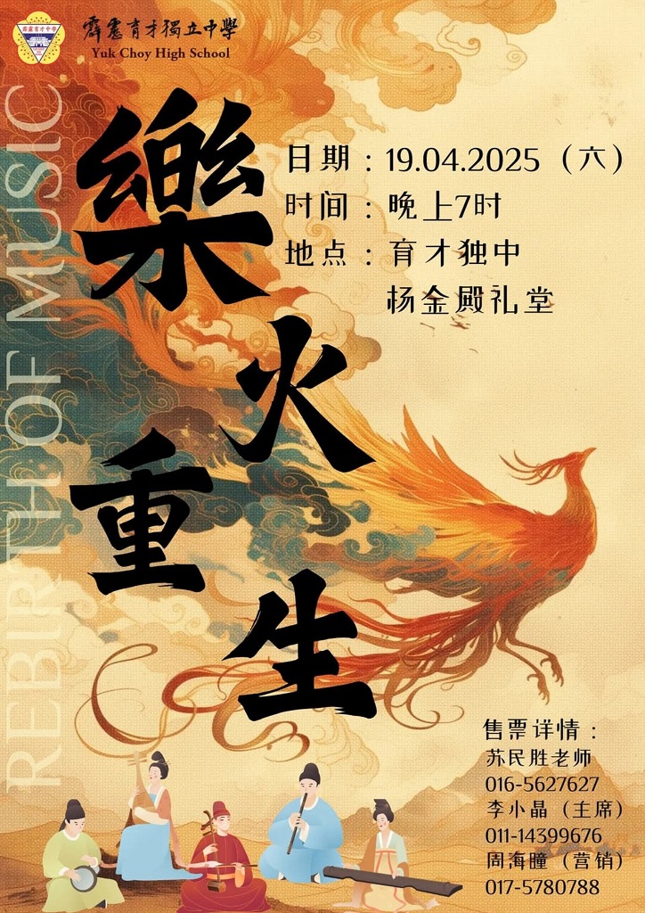 华乐团4月19日举办《樂火重生》演奏会 2025年3月11日发布 本校华乐团将于2025年4月19日(星期六)在本校礼堂举办一场名为《樂火重生》的演奏会。 【 音 乐 会 详 情 】 日期:2025年4月19日(星期六) 时间:晚上7时 地点:育才独中杨金殿礼堂 “樂火”意味着华乐团团员对于华乐文化的一腔热血,更彰显出传承与创新的激情之火;而“重生”更是有着本团要在新的一年焕发全新气象的美好期望,寓意着在华乐的天地中追寻新的可能性,为传统艺术注入时代的活力。 因为疫情,因为各种挑战,让许多人跌落谷底,就让我们来燃烧掉所有的不甘与退缩,让我们在人生的每一个低谷都能看到未来的光辉。 “樂火重生”,是一种勇敢的选择,是向过去的所有挑战宣战,是每一个不屈服、不妥协灵魂的召唤。 诚挚邀请各界人士踊跃支持《樂火重生》音乐会,共同见证华乐奏响新的篇章! 若有任何疑问,可联络以下号码。 负责老师 016 – 562 7627(苏民胜老师) 筹委会主席 011‑1439 9676(李小晶同学) 营销部组长 017 – 578 0788(周海瞳同学) 此外,亦可关注本校华乐团官方账号,该账号会持续更新演奏会的信息。 育才独中华乐团 Instagram 账号:https://www.instagram.com/ychs_chineseorchestra 本校学长团拜访“慈爱迟钝残障训练中心”捐赠物资