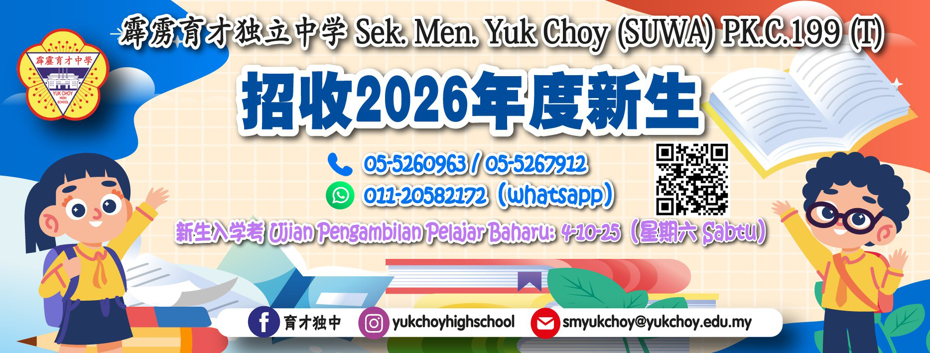 招收2026学年新生 2025年3月14日发布 本校从即日起,开始招收2026学年新生! 新生入学编班考试将于2025年10月4日(星期六)上午9时至下午1时,在本校杨金殿礼堂举行。 报名步骤如下: 1. 进行线上报名,点击以下链接或扫描二维码(QR Code)填写资料。 »»> https://forms.gle/RFvwWh2L8LVqfSsv5 2. 缴交30令吉的报名费。报名费可通过电子银行过账缴交,须备注学生姓名、家长联络电话,转账成功后,将收据电邮至本校教务处。 教务处邮址:该邮件地址已受到反垃圾邮件插件保护。要显示它需要在浏览器中启用 JavaScript。 ************************************************************************** 任何有关新生入学考试的详情,可联络: 教务处:05 – 526 7912,05 – 526 0963 本校办公时间是周一到周五,上午8时30分至下午3时30分;周六上午8时30分至中午12时,预知更多详情,可追踪以下网址。 本校网页:www.yukchoy.edu.my 衡河书展