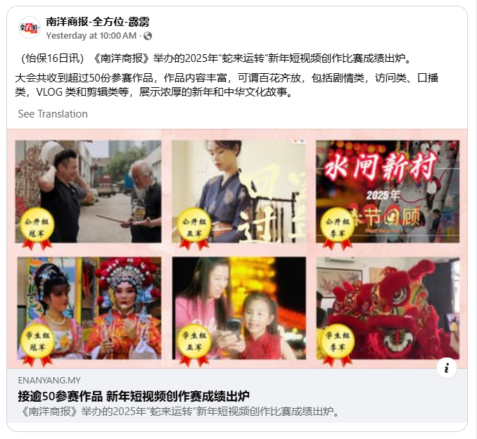 喜讯!短视频创作比赛得奖! 2025年3月18日发布 热烈祝贺本校高三理班的黄玮庆同学和陈玮捷同学在《南洋商报》主办的2025年“蛇来运转”新年短视频创作比赛中脱颖而出,凭借创意十足的构思、精彩的拍摄技巧与流畅的剪辑,成功斩获佳绩!此次比赛不仅锻炼了同学们的团队协作能力,也展现了他们在影像创作上的非凡才华。 2025年 “蛇来运转” 新年短视频创作比赛