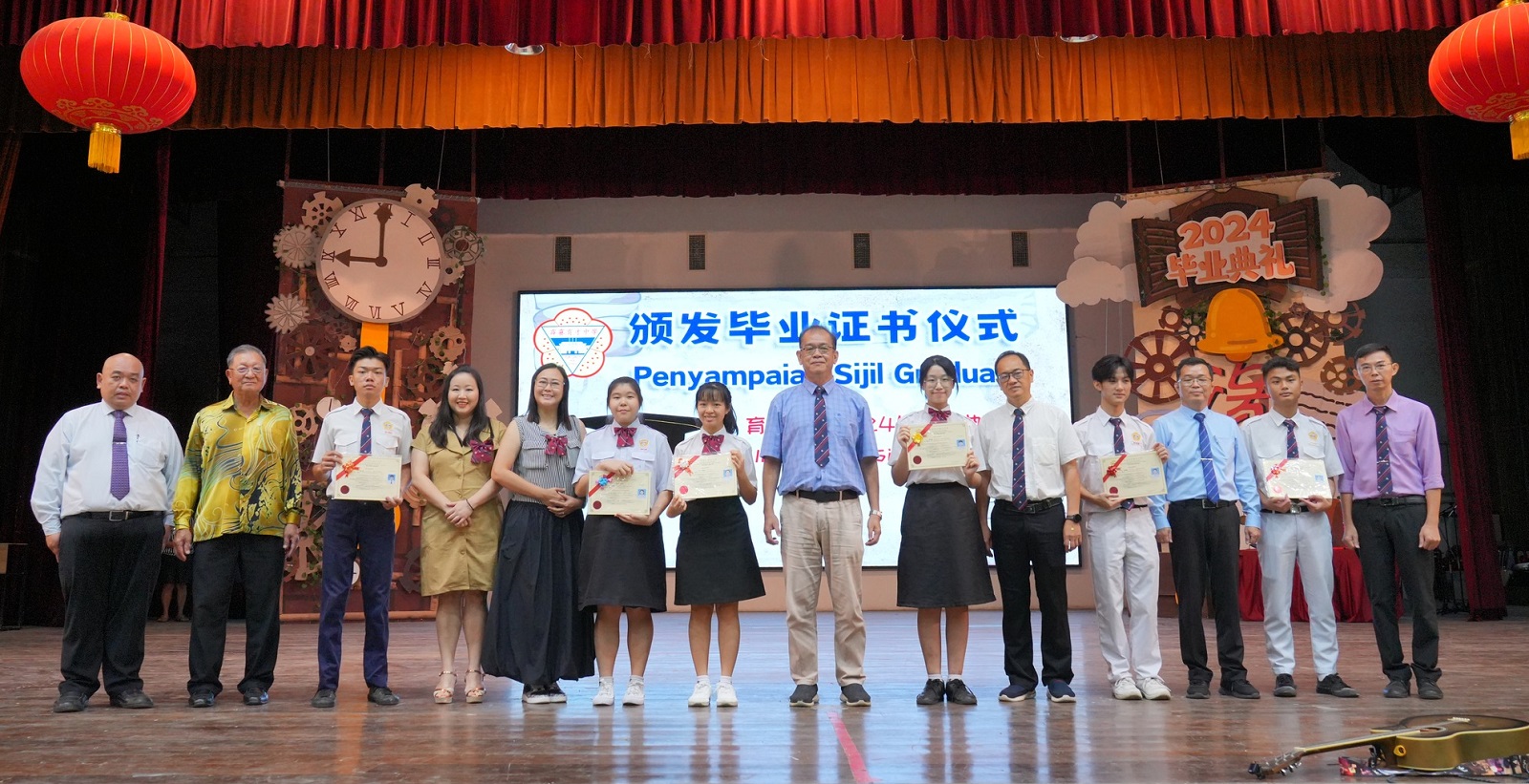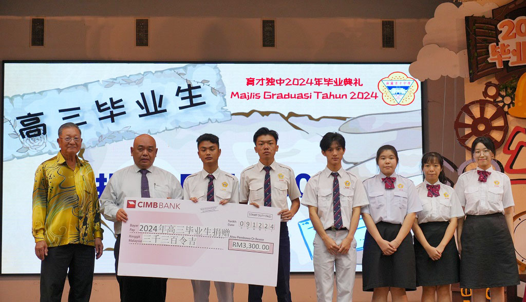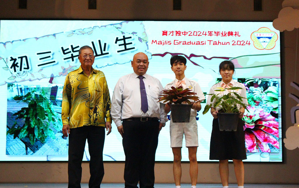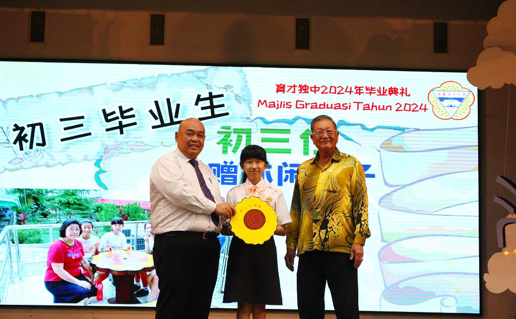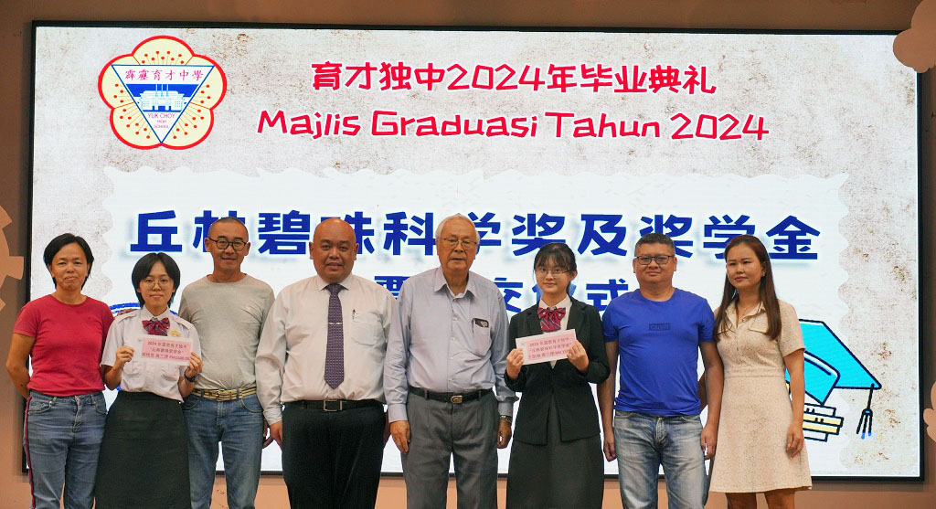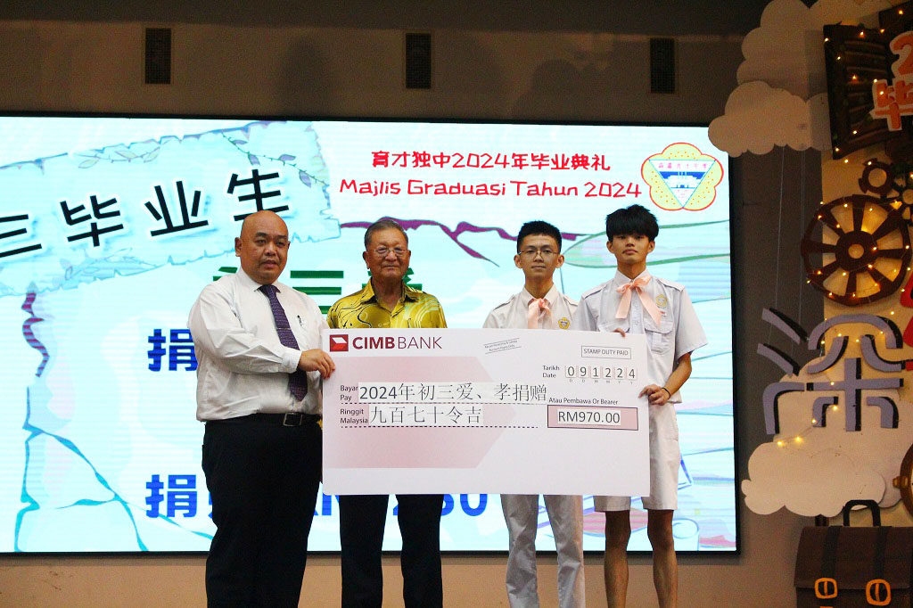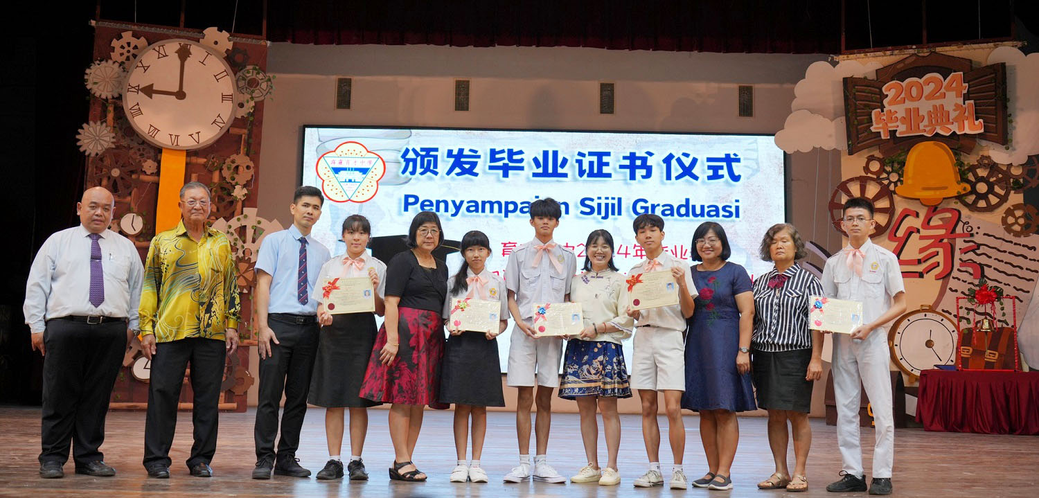 2024年 “缘 · 深” 毕业典礼 初中第89届、高中第75届、文美班第31届、汽修班第32届 敲毕业钟仪式 . 颁发毕业证书仪式 . 毕业生捐赠仪式:初三爱、初三孝捐赠970令吉 . 毕业生捐赠仪式:初三忠、初三信捐赠2盆凤梨花和2盆蔓绿绒 . 毕业生捐赠仪式:初三仁捐赠休闲石桌子 . 毕业生捐赠仪式:全体高三捐赠3300令吉 . 拿督丘才幹(右四)颁发“丘林碧珠科学奖及奖学金”支票予邓悦恩(左二)和王凯琳(右三)。 邓悦恩接领丘林碧珠奖学金,王凯琳则接领丘林碧珠科学奖。 . . . |