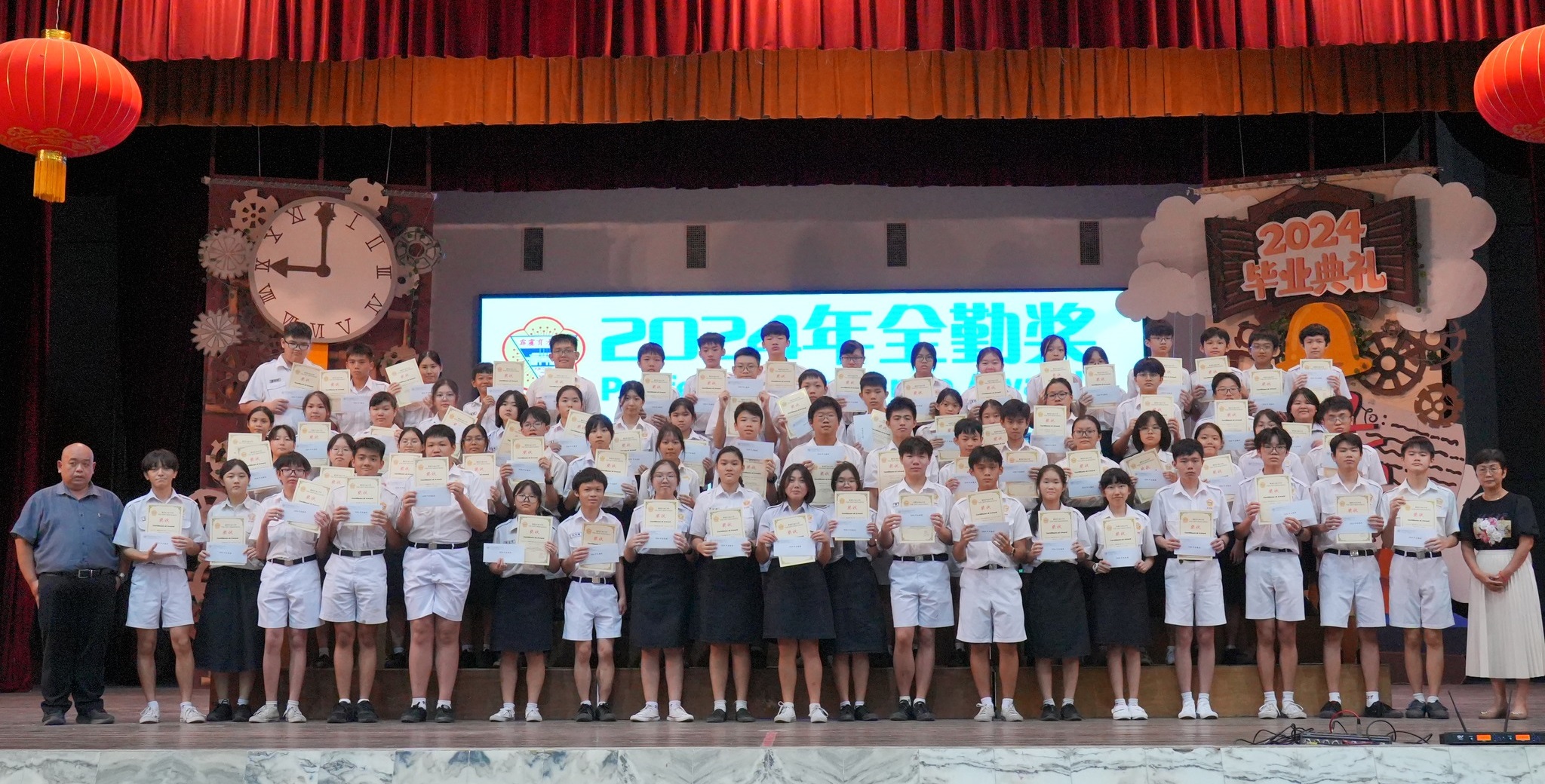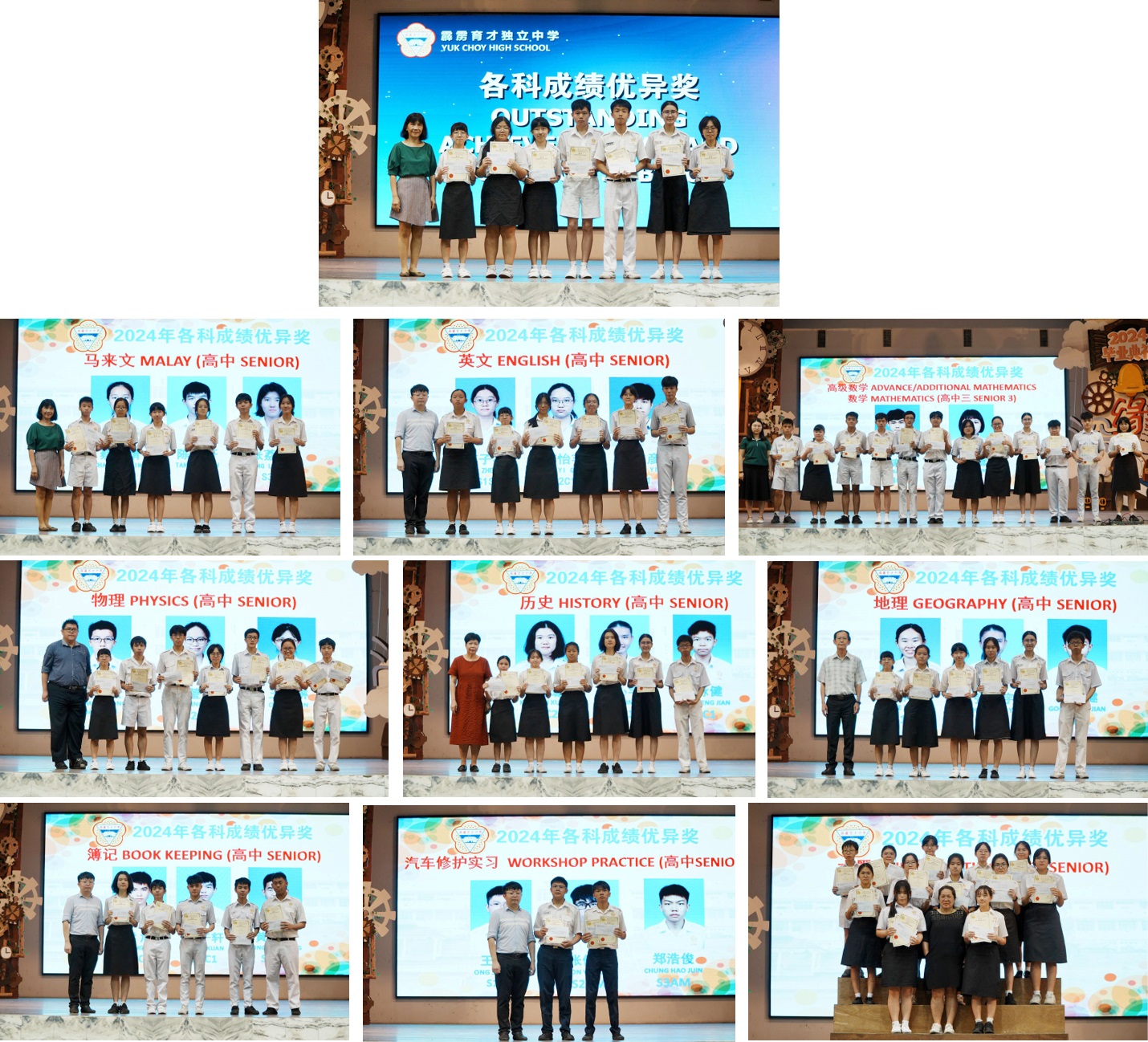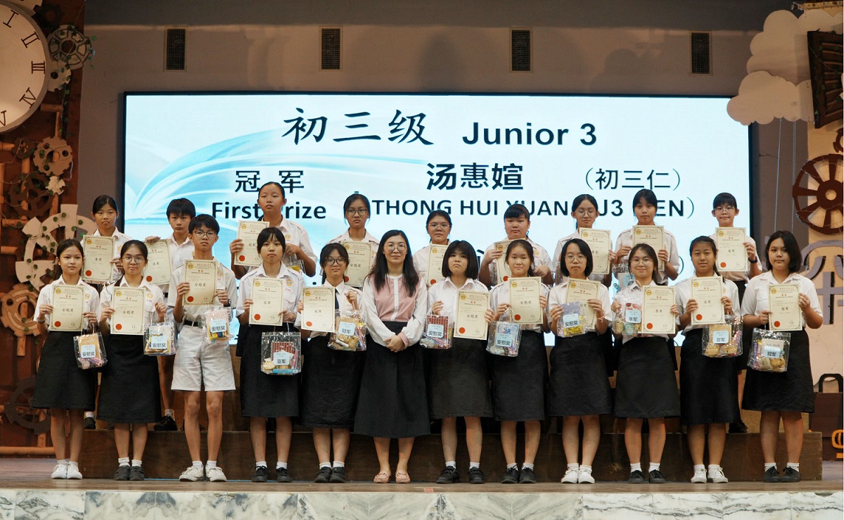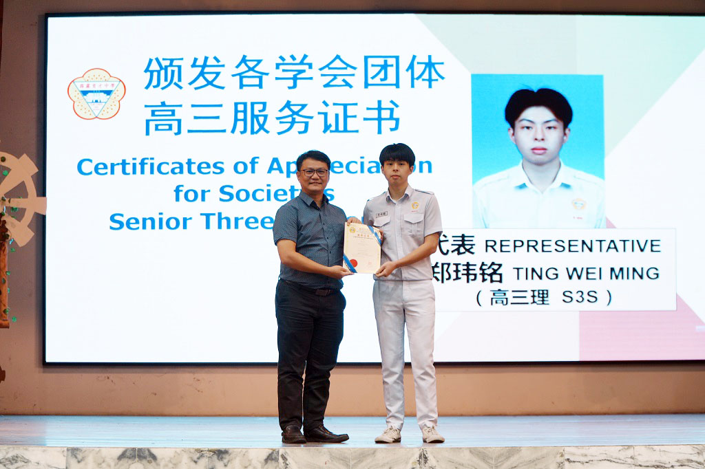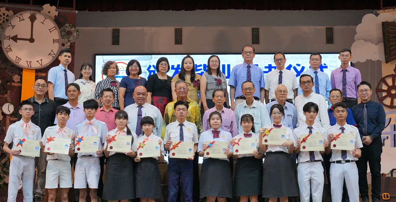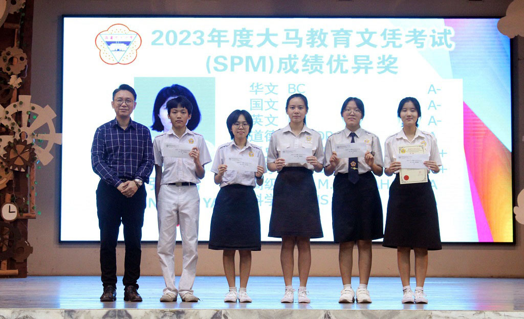 2024年颁奖暨结业典礼 2024年12月24日发布 各班前三名成绩优异奖 . 本校于日前举行2024年颁奖暨结业典礼,表扬及肯定学生在2024年的优良表现。 校方在典礼上颁发多个奖项和证书,有2023年SPM成绩优异奖、各班前三名成绩优异奖、各科成绩优异奖、学业成绩优异奖、品行优良奖、全勤奖、最佳运动员奖、摄影队和学生记者团服务证书、高三荣誉学长服务证书、各学会团体高三生服务证书,以及校内比赛的奖项,如班级卫生长年奖、图书馆阅书量比赛、“我阅读 • 我分享”比赛、学会团体网页设计比赛(主题:视频创作);还有表扬校外比赛得奖的学生,包括全球华语朗诵大赛、全霹雳华文独中男女越野锦标赛、全霹雳中小学舞蹈观摩晚会。 各科成绩优异奖 . 学业成绩优异奖 . 2023年SPM成绩优异奖 . 品行优良奖 . 全勤奖 . 2022年、2023年、2024年最佳运动员奖 . 颁发高三荣誉学长服务证书 . 颁发各学会团体高三生服务证书(由郑玮铭同学代表接领) . 颁发摄影队和学生记者团服务证书 . 班级卫生长年奖 . 图书馆阅书量比赛颁奖 . “我阅读 • 我分享”比赛颁奖 . 学会团体网页设计比赛(主题:视频创作)颁奖 . 表扬全球华语朗诵大赛得奖学生 . 表扬全霹雳华文独中男女越野锦标赛得奖学生 . 表扬全霹雳中小学舞蹈观摩晚会得奖学生 . . 本校董事会宴请嘉宾