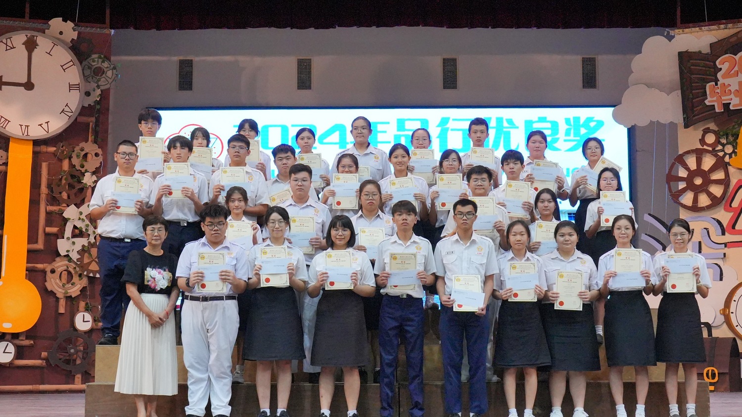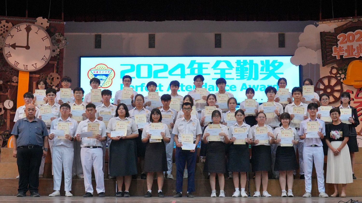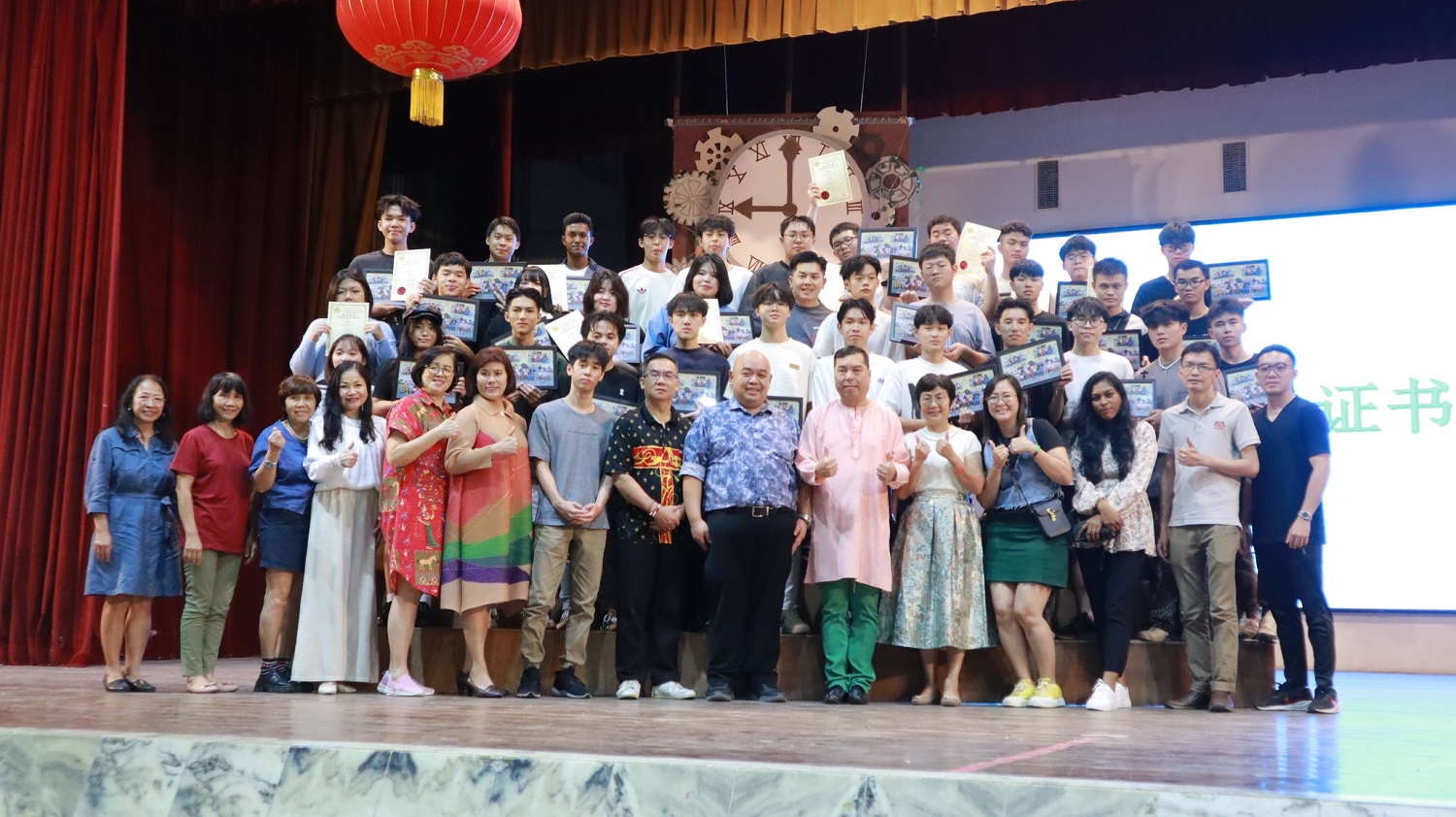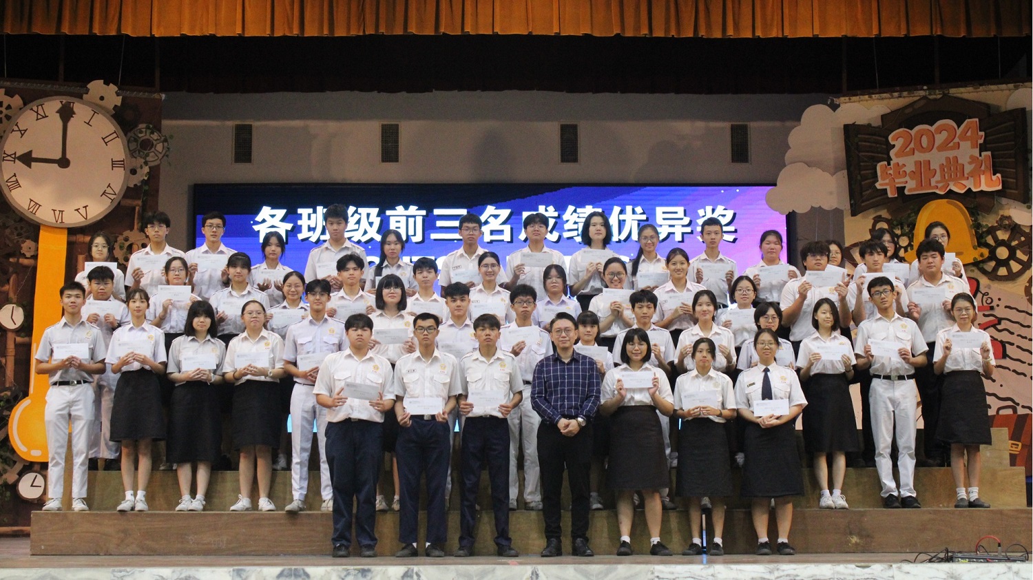 2024年颁奖暨结业典礼 2024年12月24日发布 各班前三名成绩优异奖 . 本校于日前举行2024年颁奖暨结业典礼,表扬及肯定学生在2024年的优良表现。 校方在典礼上颁发多个奖项和证书,有2023年SPM成绩优异奖、各班前三名成绩优异奖、各科成绩优异奖、学业成绩优异奖、品行优良奖、全勤奖、最佳运动员奖、摄影队和学生记者团服务证书、高三荣誉学长服务证书、各学会团体高三生服务证书,以及校内比赛的奖项,如班级卫生长年奖、图书馆阅书量比赛、“我阅读 • 我分享”比赛、学会团体网页设计比赛(主题:视频创作);还有表扬校外比赛得奖的学生,包括全球华语朗诵大赛、全霹雳华文独中男女越野锦标赛、全霹雳中小学舞蹈观摩晚会。 各科成绩优异奖 . 学业成绩优异奖 . 2023年SPM成绩优异奖 . 品行优良奖 . 全勤奖 . 2022年、2023年、2024年最佳运动员奖 . 颁发高三荣誉学长服务证书 . 颁发各学会团体高三生服务证书(由郑玮铭同学代表接领) . 颁发摄影队和学生记者团服务证书 . 班级卫生长年奖 . 图书馆阅书量比赛颁奖 . “我阅读 • 我分享”比赛颁奖 . 学会团体网页设计比赛(主题:视频创作)颁奖 . 表扬全球华语朗诵大赛得奖学生 . 表扬全霹雳华文独中男女越野锦标赛得奖学生 . 表扬全霹雳中小学舞蹈观摩晚会得奖学生 . . 本校董事会宴请嘉宾