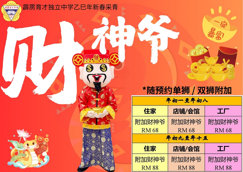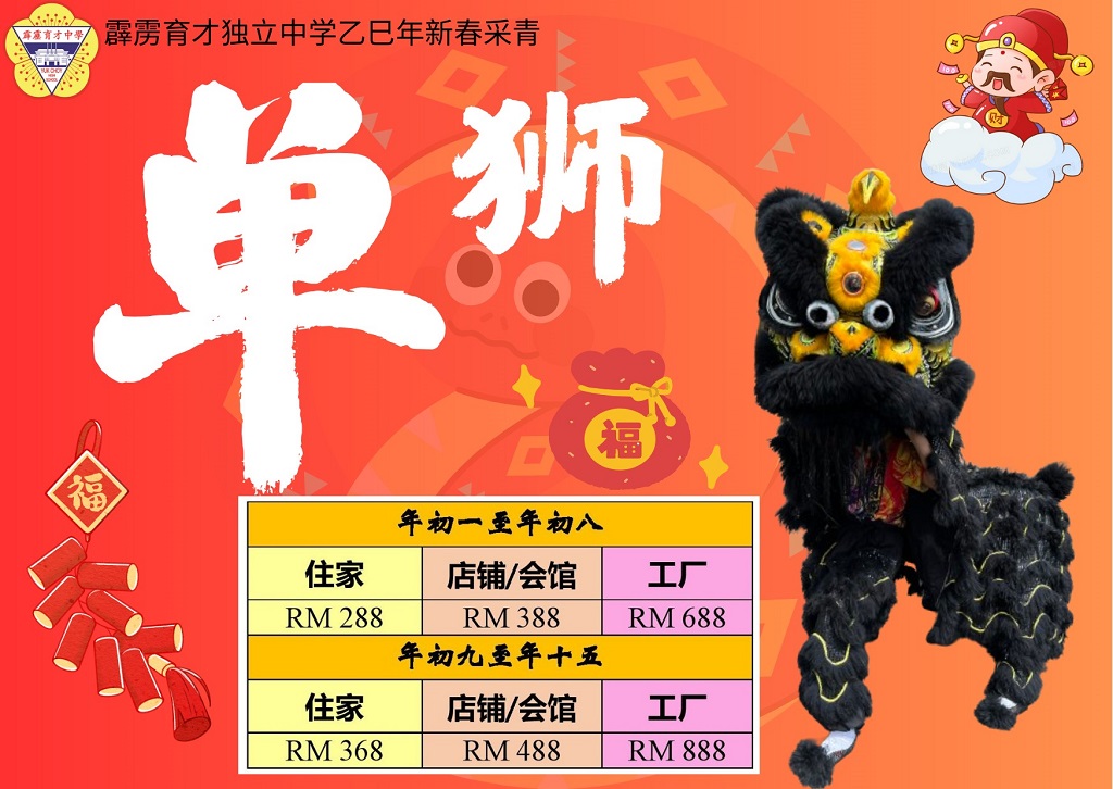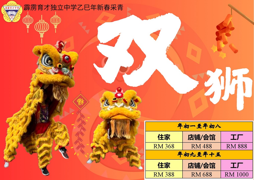 农历乙巳年新春采青预约 2024年12月14日发布 咚咚隆咚锵!咚咚隆咚锵!农历新年又要来啦! 本校龙狮团将在农历乙巳年新春期间出动瑞狮向各界采青贺年,欢迎有兴趣的人士、社团或公司预约。 联课活动主任刘誌中老师说,龙狮团将从年初一(2025年1月29日)到元宵节(2月12日)出动向民众采青贺岁,为家家户户增添佳节气氛! 他欢迎各界人士、公司行号、社团组织预约安排采青日期和时间,地点以怡保市区及近郊地区为宜。瑞狮采青贺岁除了能为家中或商店增添气氛外,也能为本校龙狮团筹募经费,一举两得。同时,他也赞许龙狮团师生在新春期间奉献出宝贵的时间来为家家户户表演助兴。 他说,目前已陆续有民众和商家向他预约舞狮。值得一提的是,往年有邀请本校龙狮团舞狮的民众与商家都主动要求上门舞狮,可见本校的龙狮团已建立起不错的口碑。因此,他感谢热心人士对育才独中的支持。 另外,董事长拿督吴国芳也于日前联同署理董事长黄亚珠先生、副董事长黄俊来先生、总务黄伟生先生、副总务张文义先生,代表董事会向各界人士拜个早年,祝愿各界身体健康、万事顺意、国泰民安!同时,呼吁各界多多支持瑞狮采青活动。陪同出席者尚有董事会执行秘书余依程小姐、黎镇光校长、刘国荣副校长、联课活动处主任刘誌中老师、助理幸齐能老师。 欲知更多详情或有意预约者,可拨电联络育才独中联课活动处(05 – 526 0963),或联络以下负责老师:刘誌中(012 – 512 9398)、幸齐能(012 – 551 0183),或留意育才独中官方脸书和Instagram。 学生发挥创意制作地理模型作品
