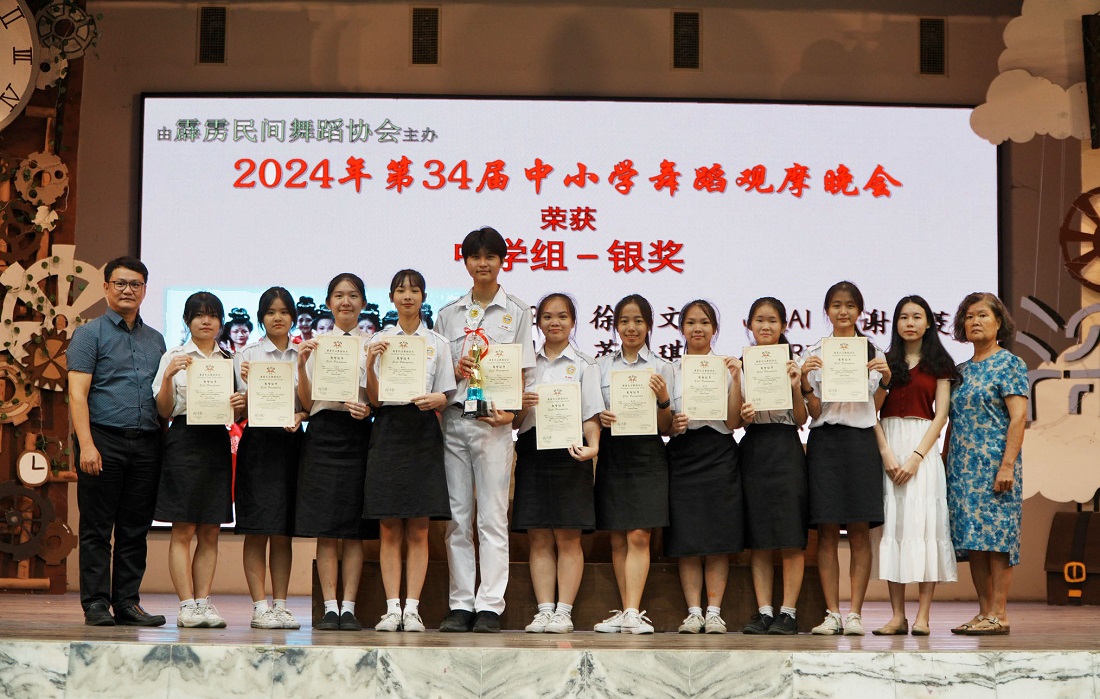 本校舞蹈团参加全霹雳中小学舞蹈观摩晚会 获得银奖 本校舞蹈团于日前在怡保三才华小举行的“2024年第34届全霹雳中小学舞蹈观摩晚会”上,以舞蹈《月下俪影》获得银奖。 这场晚会是由马来西亚华族舞蹈联合总会主催,霹雳民间舞蹈协会主办。 本校舞蹈团是由舞蹈教练杜淑琴女士指导,本次参赛的带队老师是负责老师陈湄枝。 参赛的学生包括徐绍文(高二商二)、苏嘉琪(高一文美)、黄紫菁(高三理)、谢雪而(高三文)、谢亦雯(高三商一)、谢亦菱(初一爱)、徐巧儿(初二仁)、黎永恩(初三孝)、许嘉倩(高二文美)、陆宥绚(初三仁)。 舞蹈学会负责老师陈湄枝老师祝贺获奖的参赛学员,她表示学员多次为学校取得奖项,让人感到雀跃不已,并感谢杜淑琴教练的指导。 黎镇光校长接获喜讯后赞赏参赛学员,并且鼓励他们再接再厉,发挥自己的所长,勇敢地向大众展示才华,以及透过赛事与其他舞团积极交流,在艺术领域继续探索及突破。 他表示,只要努力终究会有所回报,希望同学们能够以参赛学生作为学习榜样,发掘及锻炼自己的潜能。 本校于学校假期前最后一天(2024年12月10日)举行颁奖暨结业典礼,