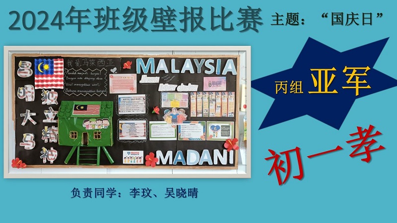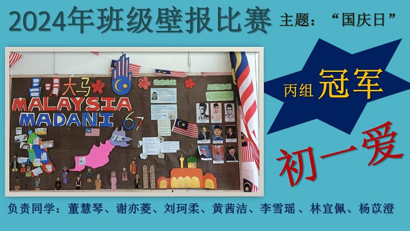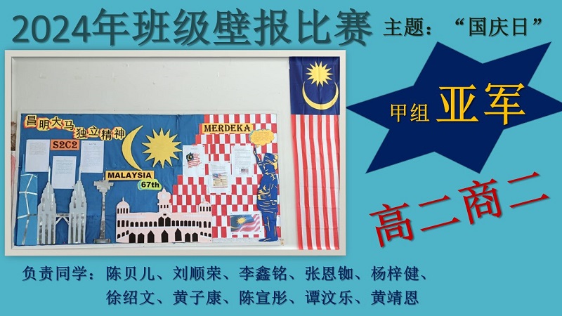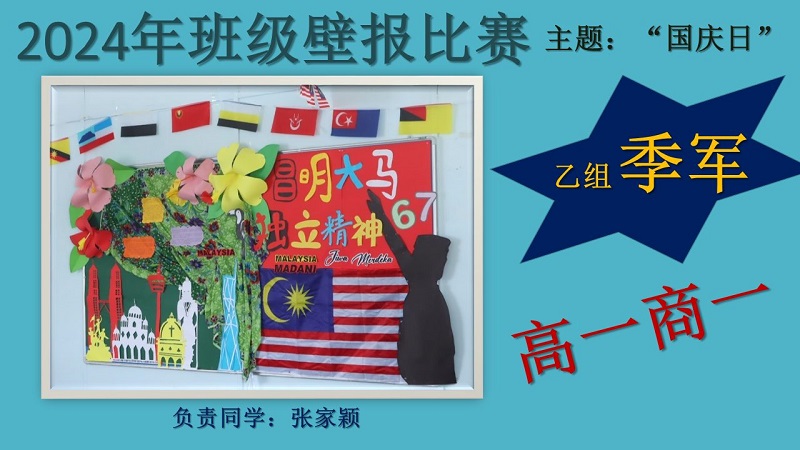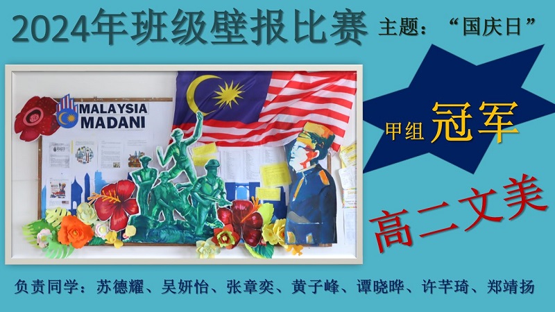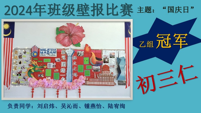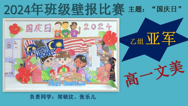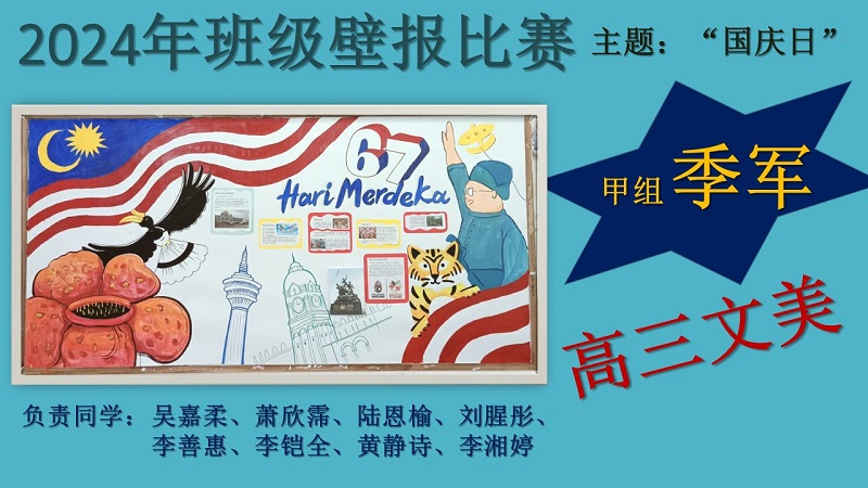 2024年班级壁报比赛(主题:国庆日)获奖班级 【 甲 组 】 冠军:高二文美 | 亚军:高二商2 | 季军:高三文美 . . 【 乙 组 】 冠军:初三仁 | 亚军:高一文美 | 季军:高一商1 . . 【 丙 组 】 冠军:初一爱 | 亚军:初一孝 | 季军:初二忠 . .