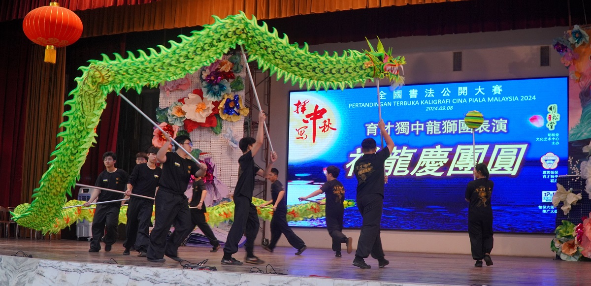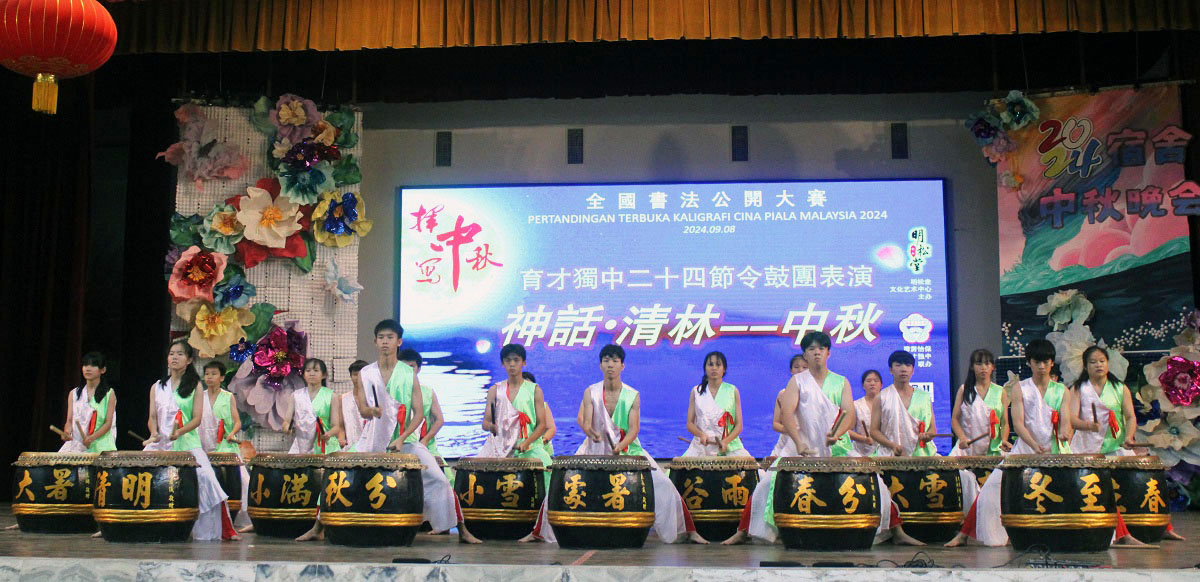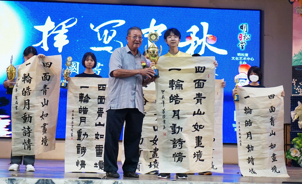 本校联办2024年“挥写中秋”全国书法公开大赛 圆满举行 2024年9月11日发布 由明松堂文化艺术中心主办,本校联办的2024年“挥写中秋”全国书法公开大赛于日前在本校校园举行,吸引了全国各地超过300名书法爱好者参加。 颁奖典礼上,首相选区特别事务官黄瑞德先生宣布,首相办公室拨款1万令吉作为大会基金,并代表移交模拟支票。大会主席明松堂文化艺术中心创办人庄御竹先生则代表明松堂文化艺术中心移交捐款3000令吉模拟支票予本校书法学会。 本校派出龙狮团、二十四节令鼓鼓队和华乐团,配合中秋节主题呈献了精彩的表演。 其他出席嘉宾包括新邦波赖区州议员黄彩仪、霹雳中华大会堂秘书长余舜基先生、霹雳韩江公会名誉会长罗润强局绅、会长拿督王培丰、明松堂文化艺术中心顾问游建新先生、本校董事长拿督吴国芳以及黎镇光校长等等。 2024年“挥写中秋”全国书法公开大赛”得奖名单: 【小学组】 一等奖:庄煜棋 二等奖:邱芷暄、庄炳棋 三等奖:刘凯彬、陈诗键 优等奖:罗子萱、陈思杉、陈恩欣、戴瑜涵、陈宣羽 【初中组】 一等奖:王子恒 二等奖:庄浩霖、胡慧晶 三等奖:蔡紫昕、梁建泓 优等奖:黄雯靖、邱怡宁、黄衍𤋮、许晟凯、段祎沋 【高中组】 一等奖:胡奕洳 二等奖:陈宥翔 三等奖:高敏媛 优等奖:方瑜宣、锺谨阑、锺耓伸、林炫彤、高敏捷 【公开组】 一等奖:许学灝 二等奖:胡奕慧 三等奖:高敏媛 优等奖:林桂英、刘凯雯、林源俊、黄振銘、陈德浩 本校得奖学生: 【 初 中 组 】 庄浩霖(初二信):二等奖 杨铠豪(初二信):佳作奖 【 高 中 组 】 佳作奖:杨凯妃(高三理)、黄碧颖(高二理)、王允元(高二理)、冯依温(高二文)、张恺恩(高一文美)