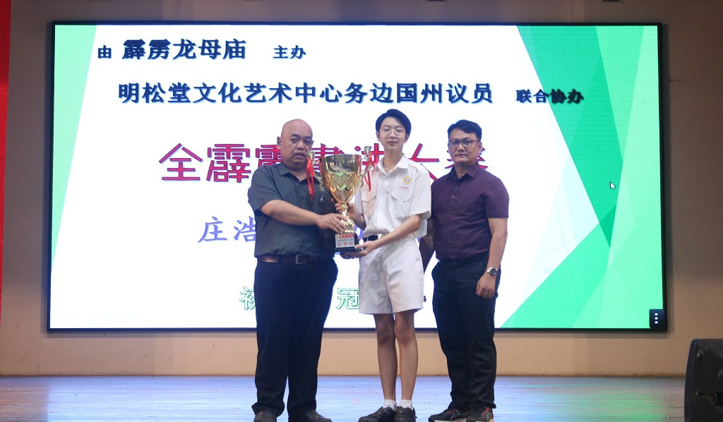 庄浩霖参加两项书法比赛得奖 本校初二信班的庄浩霖日前参加由霹雳龙母庙主办,明松堂文化艺术中心和务边国州议员联合协办的“龙母孝道全霹雳书法大赛”,荣获初中组冠军。 黎镇光校长在周会上颁发奖状和奖杯给庄同学。庄同学也把赛会颁发的“全霹雳书法大赛荣誉榜”奖杯移交给校方,由黎校长接领,联课活动处主任刘誌中老师陪同见证。 此外,庄同学还参加了由马来西亚佛山总商会主催,明松堂文化艺术中心、万聚水源有限公司以及霹雳珠宝瓜拉光华小联办的“孝道尊师全国书法大赛”,荣获初中组特优奖。 庄同学表示非常高兴能够获奖,这份荣誉是对他努力的肯定,并且是鼓励自己坚持锻炼和提高书法水平的动力。 摄影:张迪信(高一文)、杨伟恒(高一商1) 2024年全霹雳跆拳道州级比赛:自由搏击 铜奖、套路 银奖