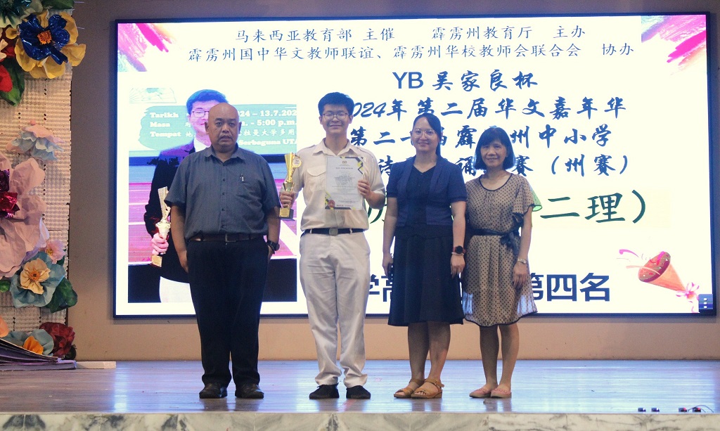 YB吴家良杯2024年第二届霹雳州华文嘉年华 第二十届霹雳州中小学华语诗歌朗诵比赛 主催:教育部 主办:霹雳州教育厅 协办:霹雳州国中华文教师联谊会、霹雳州华校教师会联合会 陈历旗(高二理):高中组 第4名 黎镇光校长在周会上表扬陈同学并感谢陈丽华老师的指导,教务主任胡丽珍老师也一同上台分享得奖喜悦。 2024年“为您导航”升学与辅导教育资讯日
