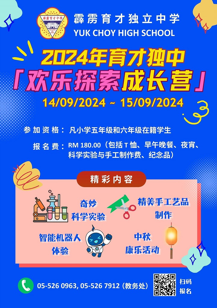 本校 “2024年欢乐探索成长营” 开始接受报名 2024年6月29日发布 想在学校假期给孩子一个不同的学习体验吗?欢迎报名参加即将于9月14日至15日(星期六及日)举行的“2024年育才独中欢乐探索成长营”。 这项两天一夜的成长营在本校校园举行,公开给小学五年级和六年级的学生参加,报名费为180令吉,包含T恤、膳食、住宿、文具、环保袋、手工艺品材料、保险费等费用。 成长营将结合多项富有趣味性的活动,如数理科相关的奇妙科学实验、美术科相关的精美手工艺品制作、机器人相关的活动、康乐活动等等,内容充实和多姿多彩。 另外,中秋节临近,营方也将特别安排一场中秋晚会,让孩子们进行猜灯谜、团康、提灯笼游校园等中秋活动。 成长营已开始接受报名,校方也将安排教师到怡保区的华小进行宣传活动,让华小的师生对这项活动有更深入的了解。 报名可扫描二维码或点击链接:https://forms.gle/DqUR5cHLgcqKymkUA 成长营将在9月14日上午9时至9时40分报到后开始,9月15日下午1时结束。家长们送孩子前来入营的同时,也能顺道参观育才独中校园,并且向教务处了解课程咨询。欲知详情,可致电 05 – 526 0963 或 05 – 526 7912 联络本校教务处。 2024年马来西亚挑战杯舞蹈比赛:独舞项目金奖、银奖