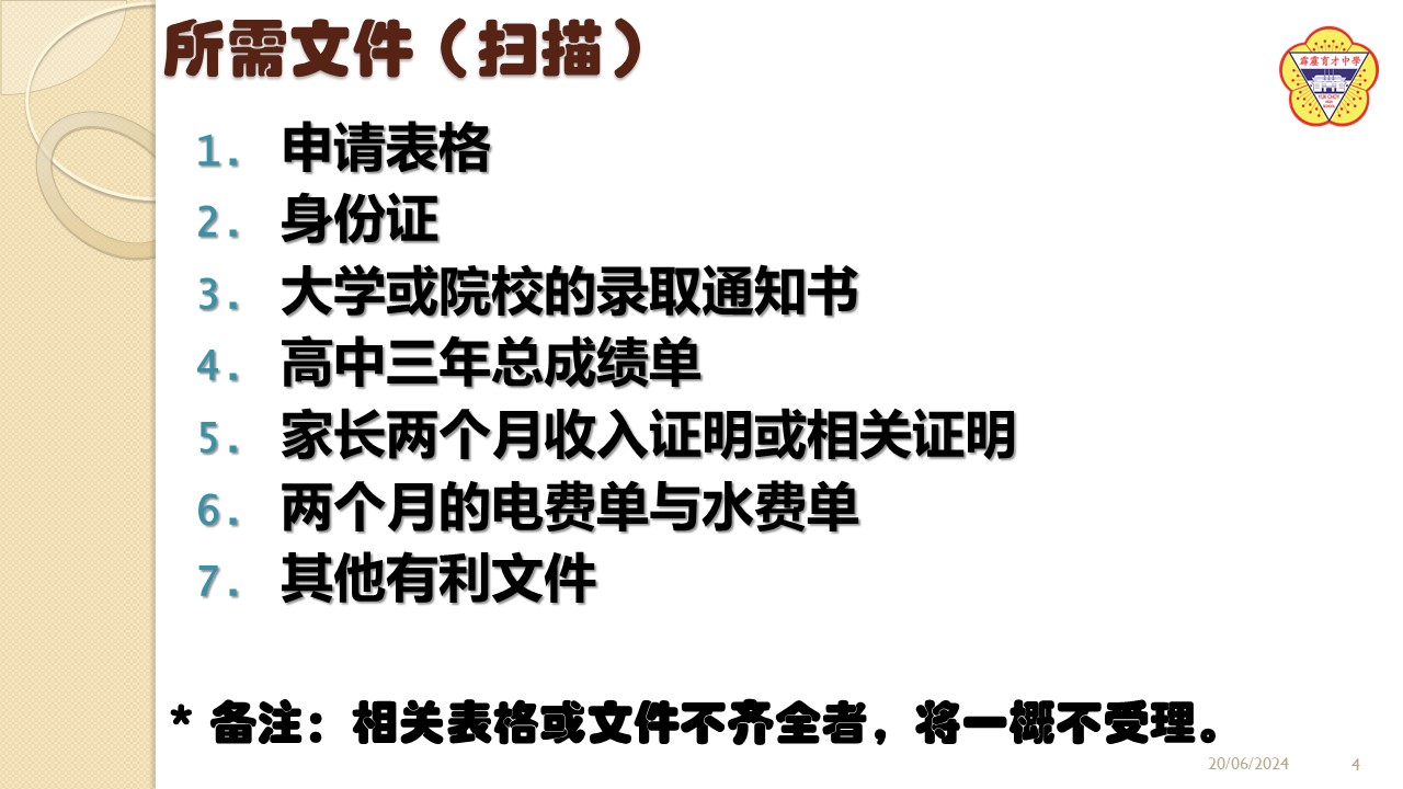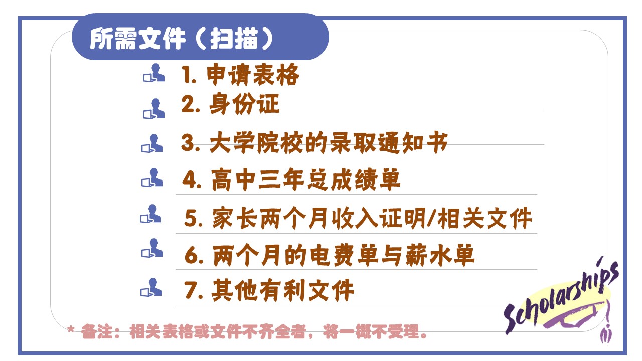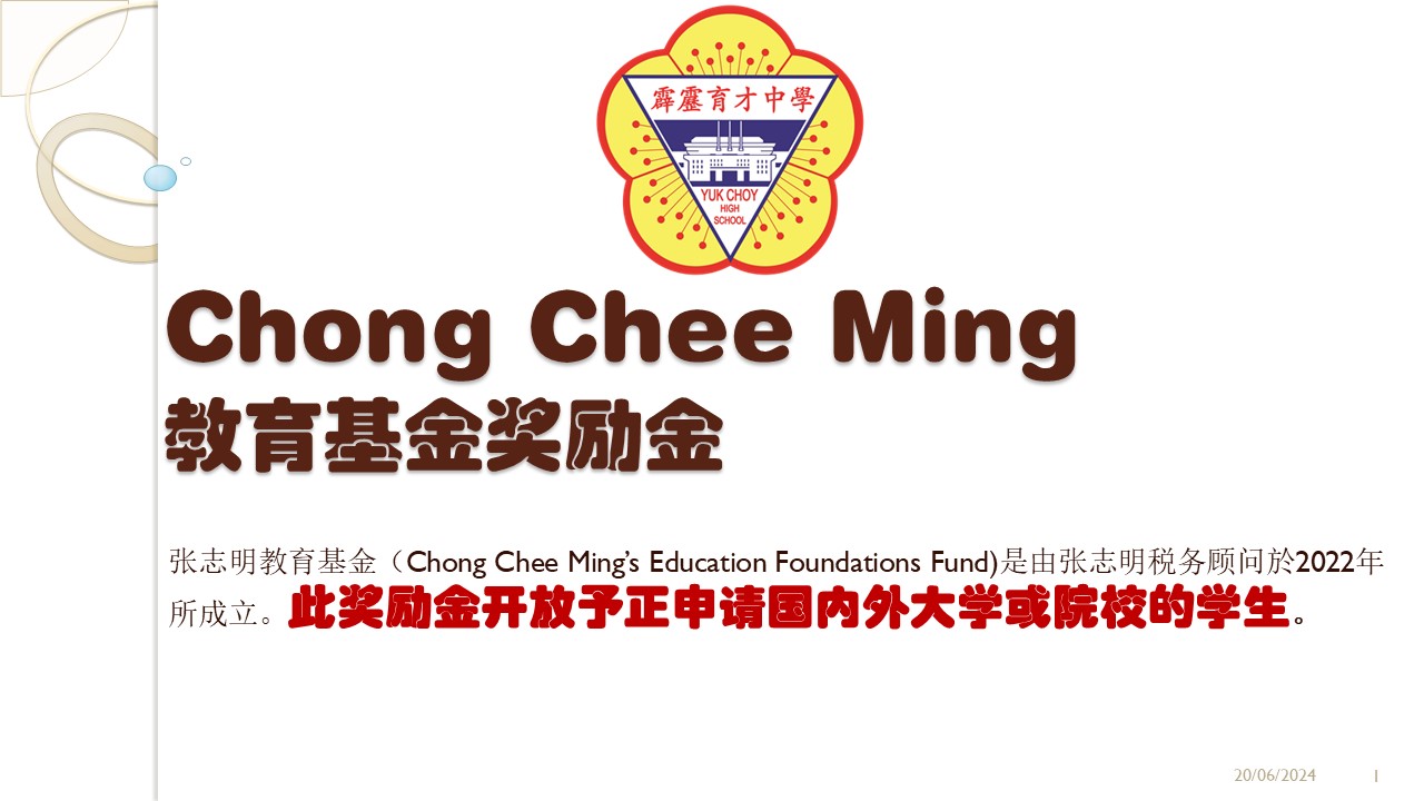 2024年度“Soong HS教育基金”开始接受申请 2024年6月22日发布 2024年度“Soong HS教育基金”已经开始接受申请。凡是符合资格的2023年高三毕业校友,可向辅导处领取申请表格或查询详情。 2024年度“Chong Chee Ming教育基金奖励金”开始接受申请