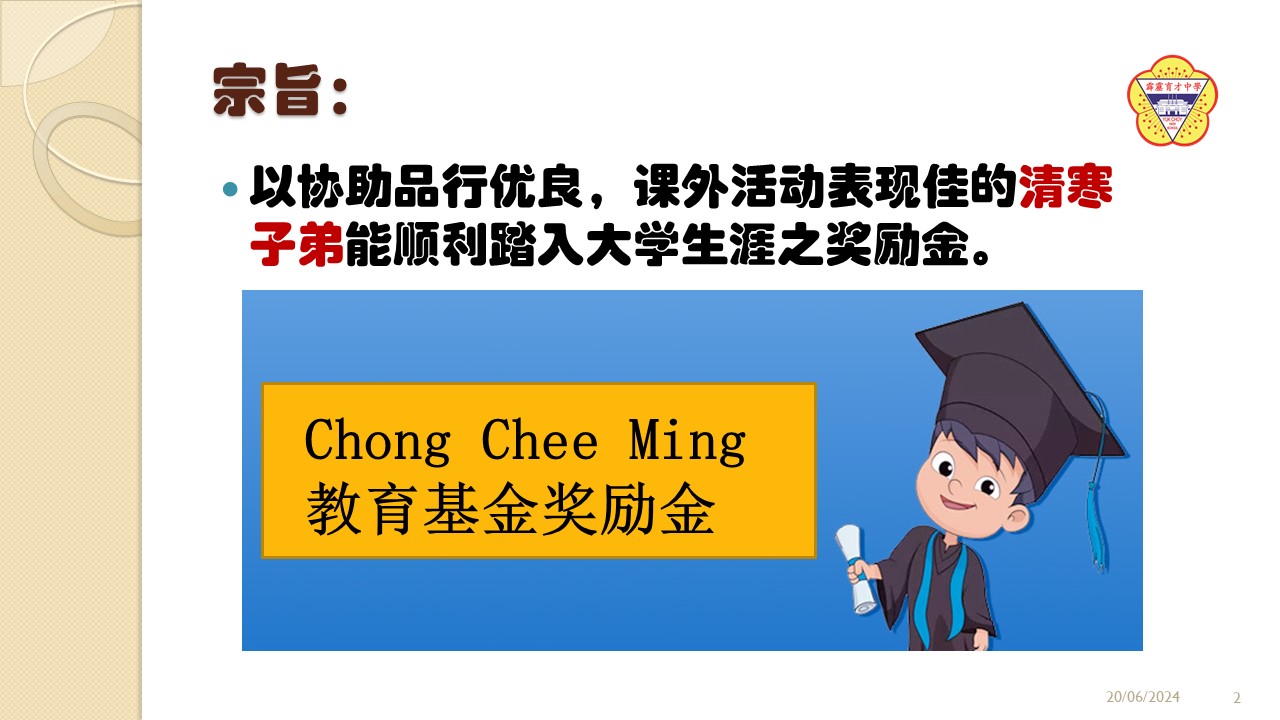2024年度“Chong Chee Ming教育基金奖励金”开始接受申请 2024年6月22日发布 2024年度“Chong Chee Ming教育基金奖励金”开始接受申请。凡是符合资格的2023年高三毕业校友,可向辅导处领取申请表格或查询详情。 配合双亲节 本校辅导处举行“我和我的家人”感恩活动