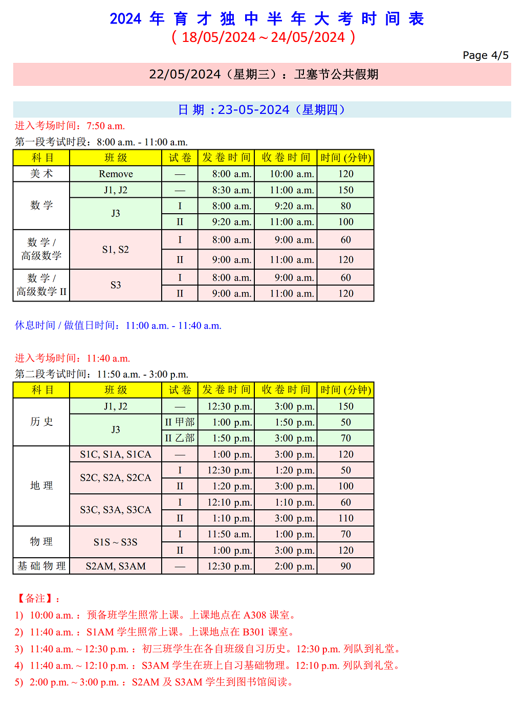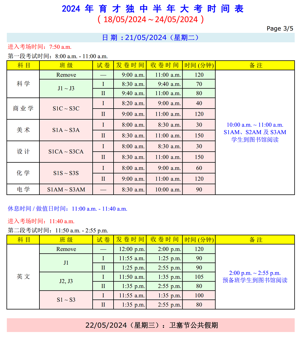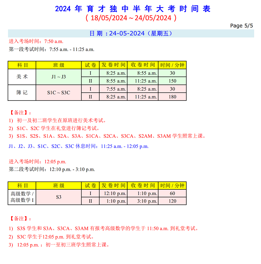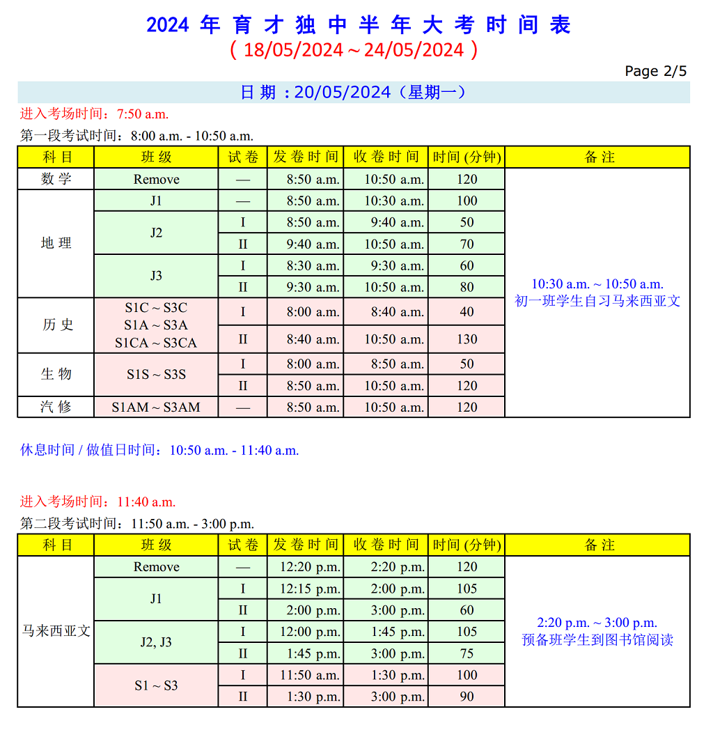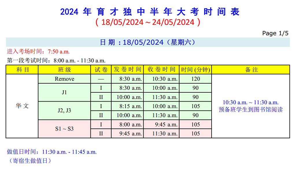 半 年 大 考 时 间 表 日期:18.05.2024(星期六)~ 24.05.2024(星期五) 点击图片可浏览和下载考试时间表。
