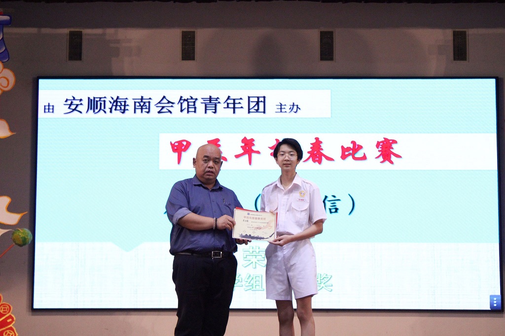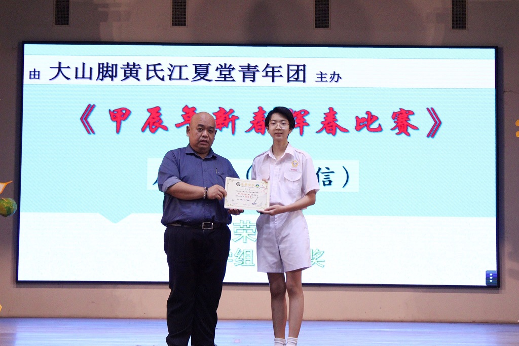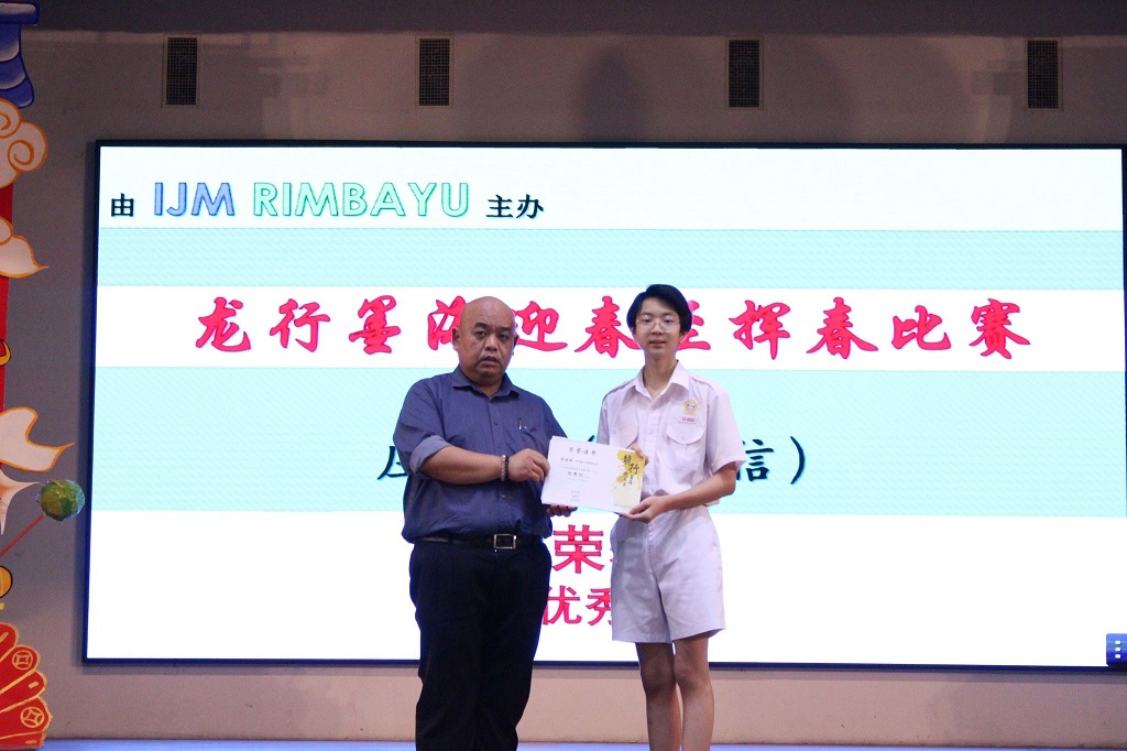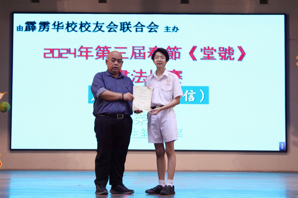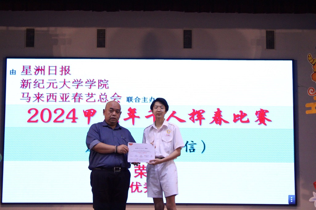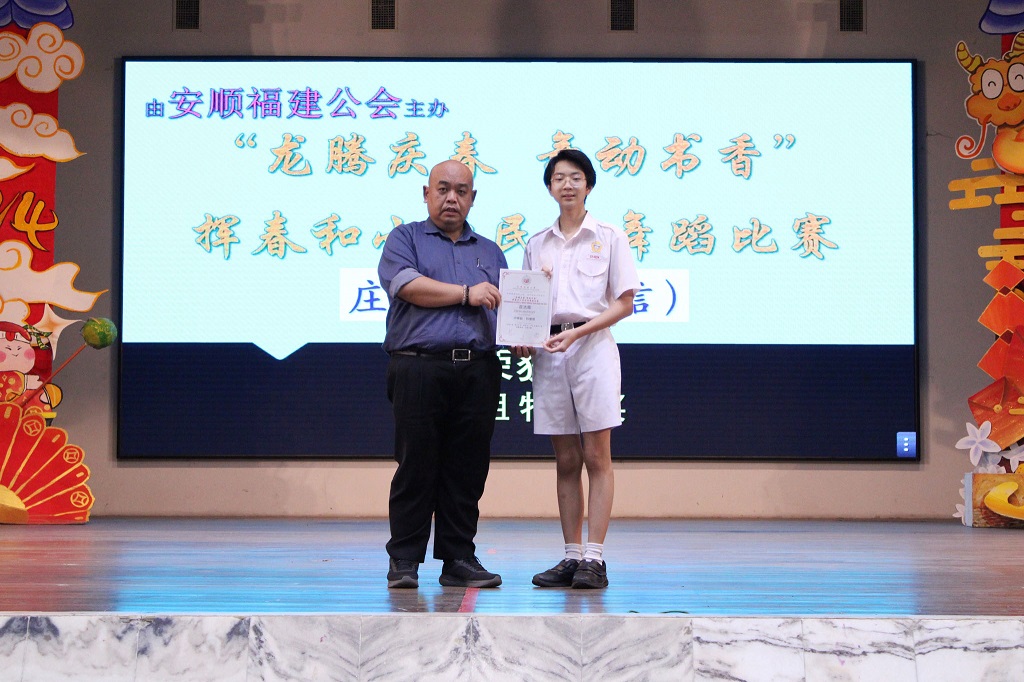 庄浩霖参加多项书法比赛得奖 本校书法好手 — — 初二信班的庄浩霖日前参加多项校外书法比赛并得奖,黎镇光校长于周会上颁奖和表扬庄同学。 庄浩霖同学所参与的书法比赛和获得奖项: 1. 安顺福建公会主办的“龙腾庆春 舞动书香”挥春和小学民间舞蹈比赛:中学组 特优奖 2. 霹雳华校校友会联合会主办的2024年第三届春节《堂号》书法比赛:学生组 冠军 3. 马来西亚国际现代书画联盟柔佛州联委会主办的龙腾永旺《永旺杯》全国挥春大赛总决赛:初中组 三等奖 4. 安顺海南会馆青年团主办的“甲辰年挥春比赛”:中学组 优秀奖 5. 大山脚黄氏江夏堂青年团主办的“甲辰年新春挥春比赛”:中学组 优秀奖 6. 适耕庄潮州会馆主办的“2024年甲辰年挥春比赛”:中学组 优秀奖 7. 马来西亚德教联合总会青年团主办的“第三届甲辰年全国挥春公开赛”:初中组 优等奖 8. IJM RIMBAYU主办的“龙行墨海迎春至挥春比赛”:优秀奖 9. 星洲日报、新纪元大学学院和马来西亚春艺总会联合主办的“2024甲辰年千人挥春比赛”:优秀奖 10. 雪隆叶氏宗祠妇女组及青年团联合主办的“2024年《传承美学》中小学书法比赛”:初中组 优秀奖 摄影:许芷奕(高一商2)、杨伟恒(高一商1) 本校与国立台湾大学签署合作协议