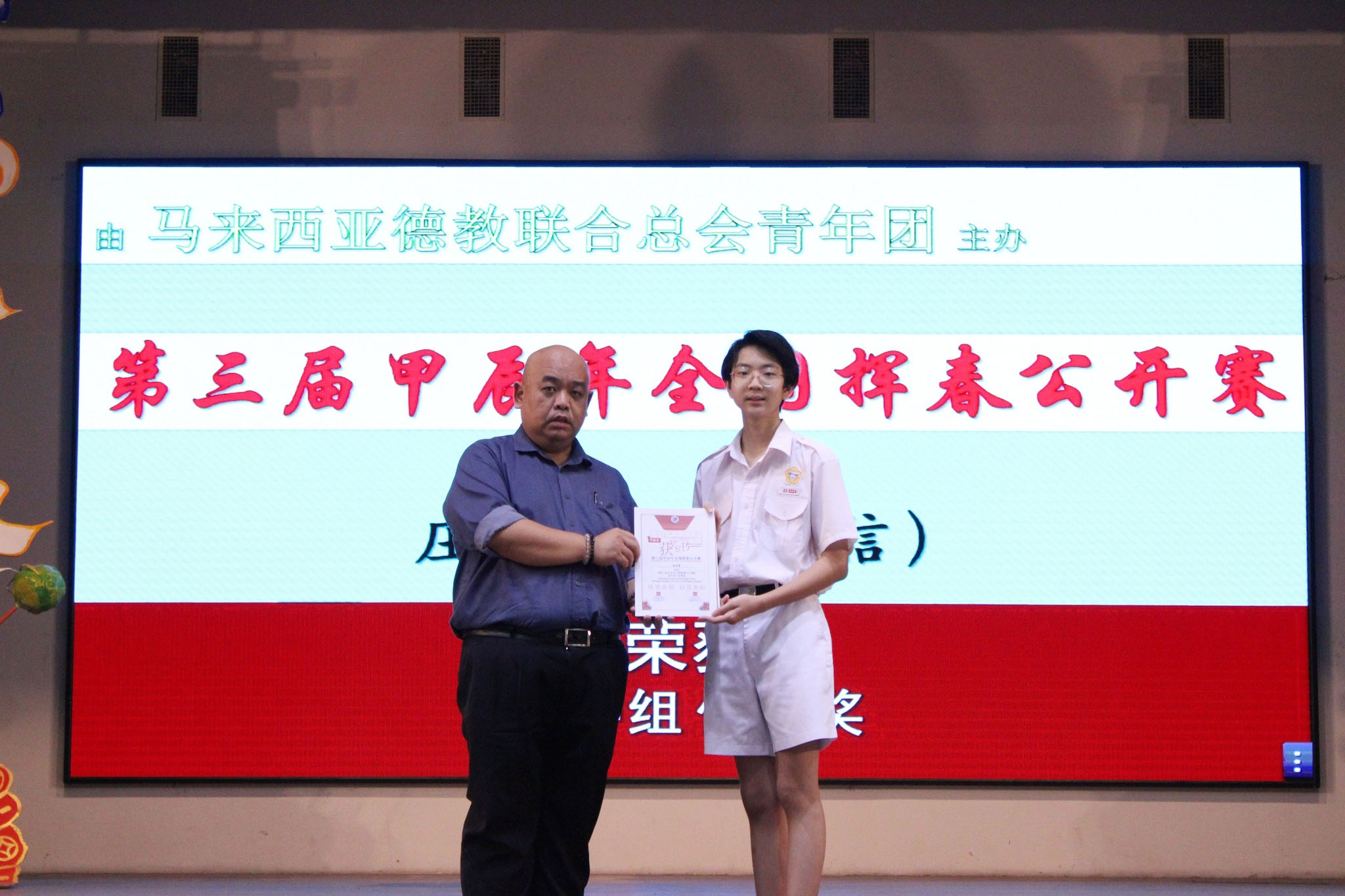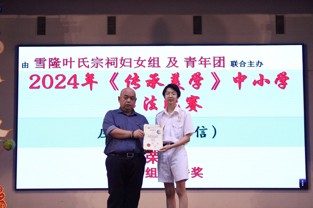 2024年全霹雳中小学象棋锦标赛 主催:霹雳州教育局 主办:霹雳象棋总会 周梓康(初二孝):15岁以下组别第4名 黎镇光校长于周会上颁奖和表扬周梓康,带队老师陈志文老师一同上台分享得奖喜悦。 庄浩霖参加多项书法比赛得奖