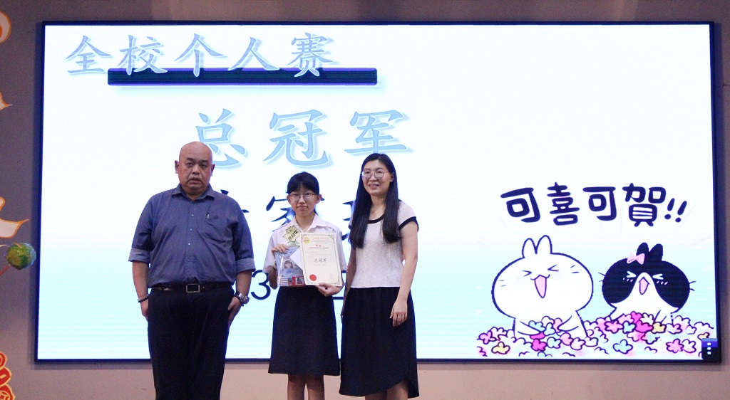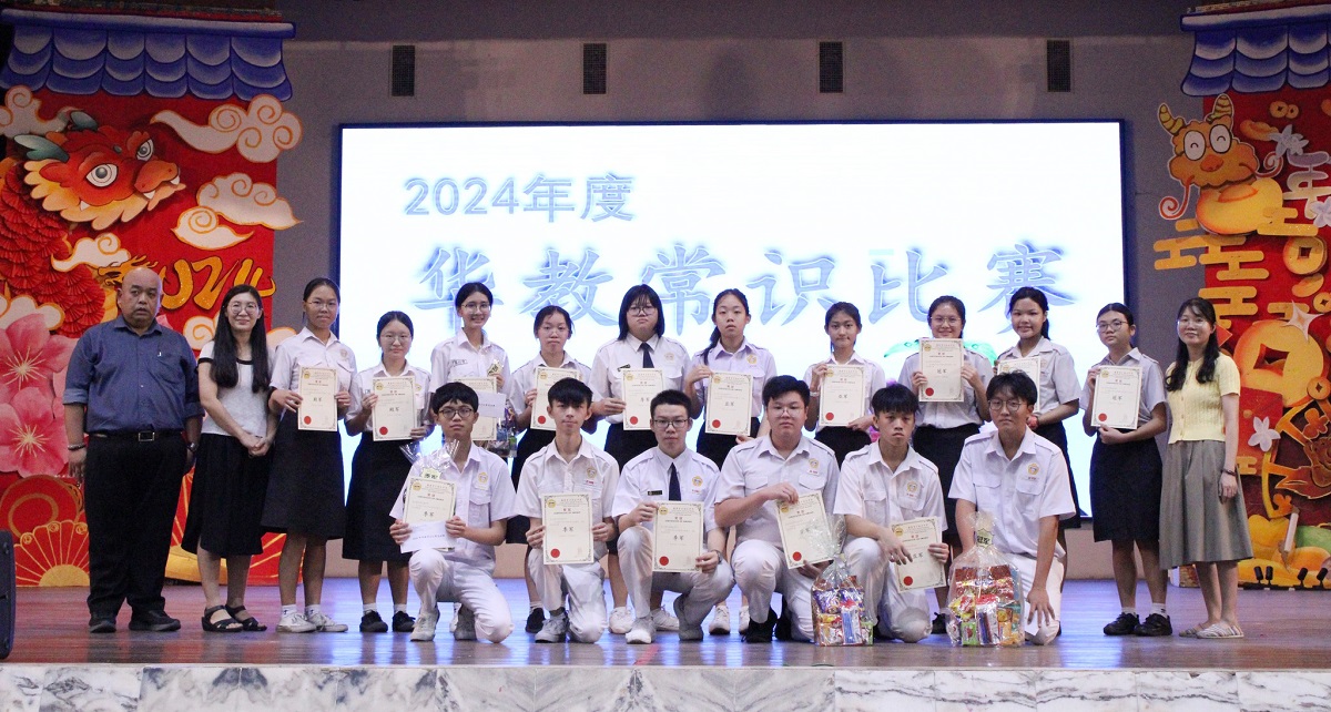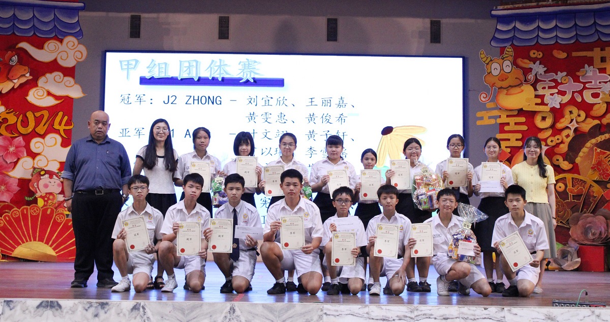 2024年校内华教常识比赛得奖名单 主办:图书、校史暨文物馆 黎镇光校长于周会上颁奖和表扬所有得奖的同学,希望同学们在参与比赛的同时也能够获得更多有关华文独中复兴运动的相关资讯,并珍惜华教先贤在捍卫华文教育方面所作出的贡献。 . 【个人赛】总冠军:黄家瑜(初三仁) 【甲组团体赛】 冠军:初二忠(刘宜欣、王丽嘉、黄雯惠、黄俊希) 亚军:初一爱(叶文翊、黄子轩、翁以琳、李雪瑶) 季军:初二信(刘咏芯、黄恺承、彭佳乐、姚征宇) 殿军:初二仁(夏宪轩、黄滢蒽、张卫俊、许荧洁) 【乙组团体赛】 冠军:初三仁(黄家瑜、吴沁而、黄旖馨、刘捷轩) 亚军:高一理(贝玮棋、许卉珏、蔡鎵情、陈鸿策) 季军:高一商1(陆宥嘉、卢恩瑩、陈昊阳、黄雪嫣) 殿军:高一文(张铭恒、曾敬轩、李铭均、简以哲) 【丙组团体赛】 冠军:高二理(鍾建辉、林妍杉、王垲铮、黄碧颖) 亚军:高二商2(吴梓稀、谭汶乐、何咏媚、陈贝尔) 季军:高三理(黄恺谦、张頔垚、谢维怡、陈勇旭) 殿军:高二商1(阮龄萱、李芷翘、张心宇、李雪琦) . 摄影:许芷奕(高一商2)、杨伟恒(高一商1) 2024年第四次班级卫生整洁比赛(初中组及高中组)获奖班级