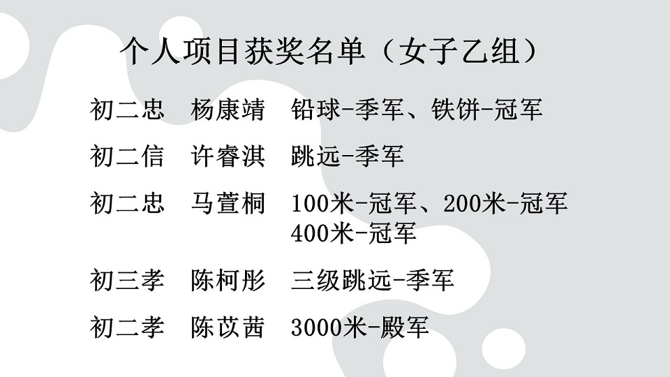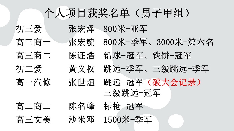 2024年第四次班级卫生整洁比赛(初中组及高中组)获奖班级 【初 一 级】 冠 军:初一忠 | 亚 军:预备班 . 【初 二 级】 冠 军:初二忠 | 亚 军:初二信 . 【初 三 级】 冠 军:初三仁 | 亚 军:初三忠 . . 【高 一 级】 冠 军:高一理 | 亚 军:高一商2 . .【高 二 级】 冠 军:高二商2 | 亚 军:高二商1 . .【高 三 级】 冠 军:高三商1 | 亚 军:高三商2 . 2024年首届儿童青少年武术套路公开赛:初中组传统太极拳冠军