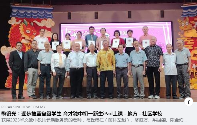 第33届全国华人舞蹈节暨第22届全国华校校际舞蹈观摩赛 本校舞蹈团于日前参与由马来西亚华族舞蹈联合总会主催,雪隆福建会馆主办的第33届全国华人舞蹈节暨第22届全国华校校际舞蹈观摩赛,团员们的曼妙舞姿成功获得评审们的青睐,在公开组中凭着《浮生图》荣获金奖和中学组中以《剑•语》荣获银奖,可喜可贺! 本校感谢杜淑琴教练的指导和团员们的努力,让付出的汗水获得了回报! 公开组 金奖:《浮生图》 中学组 银奖:《剑•语》 带队老师:陈湄枝老师 舞蹈员: (资料和照片由陈湄枝老师提供) 黎镇光校长在周会上表扬获奖学生。 2024年开学典礼