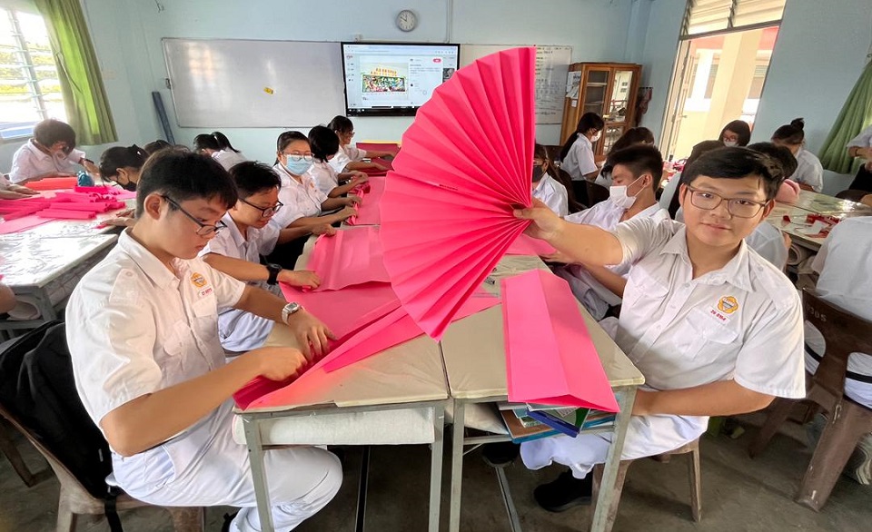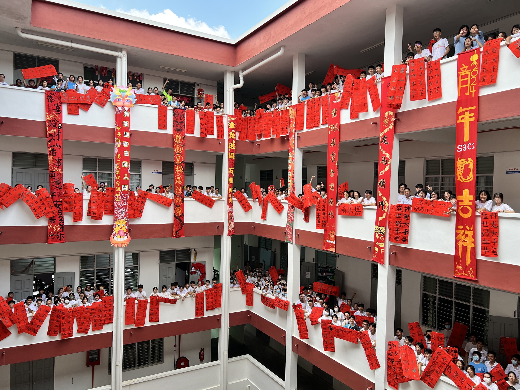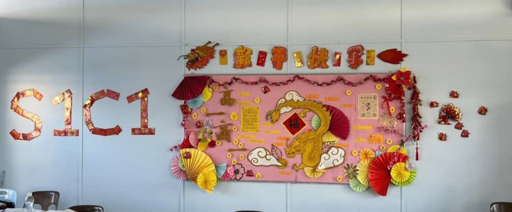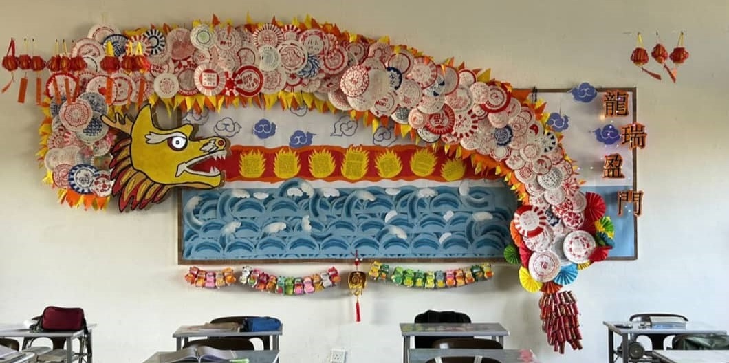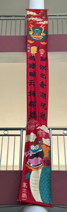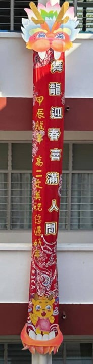 新春条幅贺新岁 2024年2月9日发布 配合农历新年,本校联课活动处举办了“班级新春条幅设计比赛”,各班的同学发挥创意为5米长的布条设计了不同的造型。条幅张挂在校园各个角落,充满浓浓的新年气氛! 文美班学生制作龙年装饰 龙吟国瑞庆丰年
