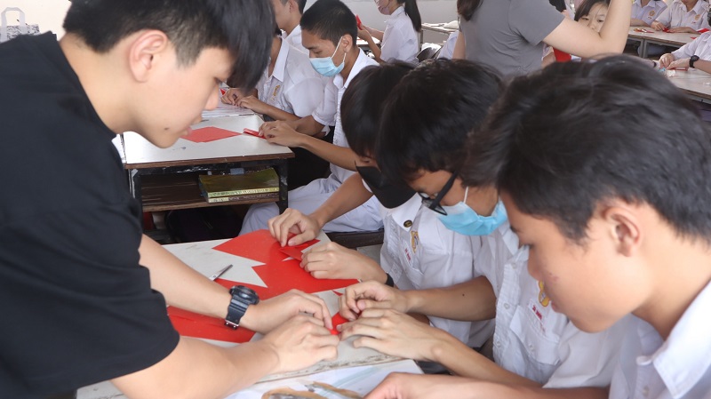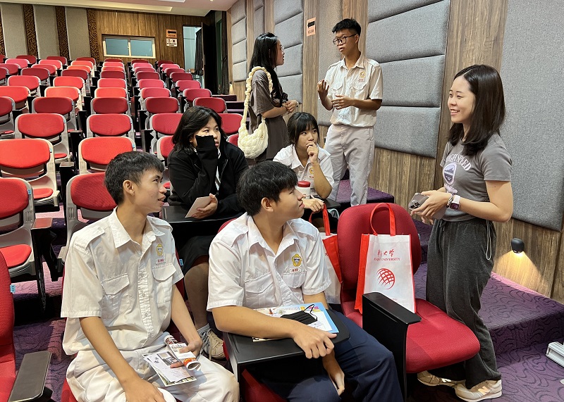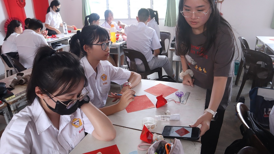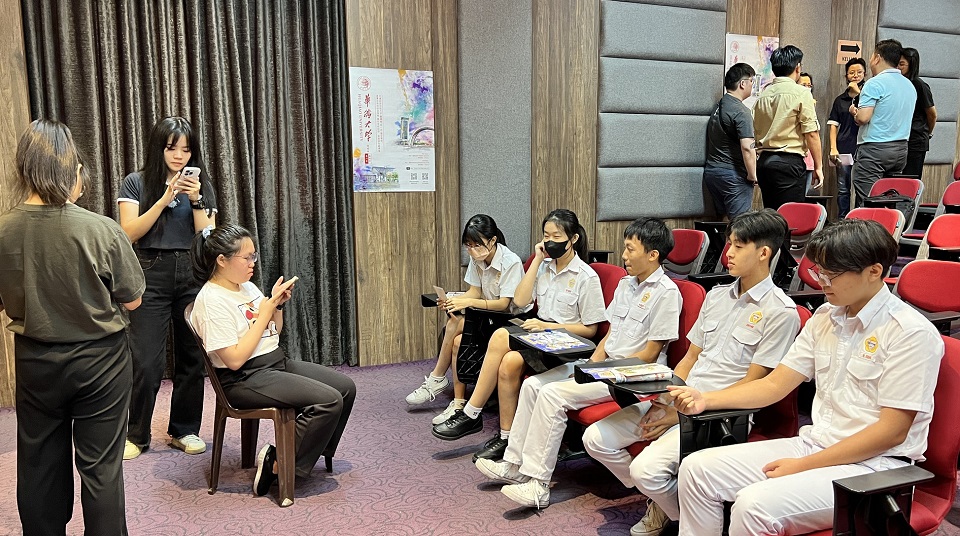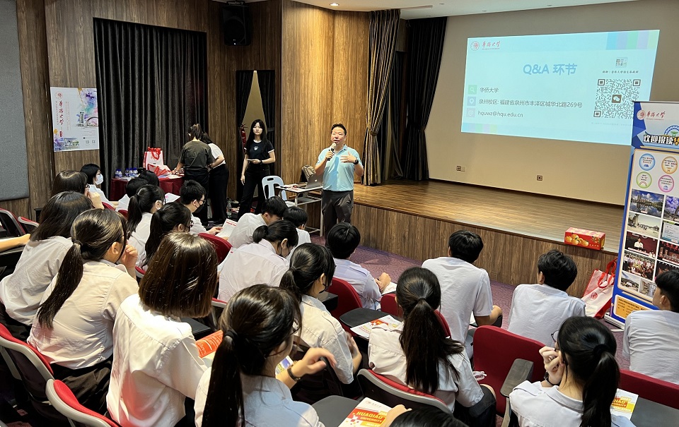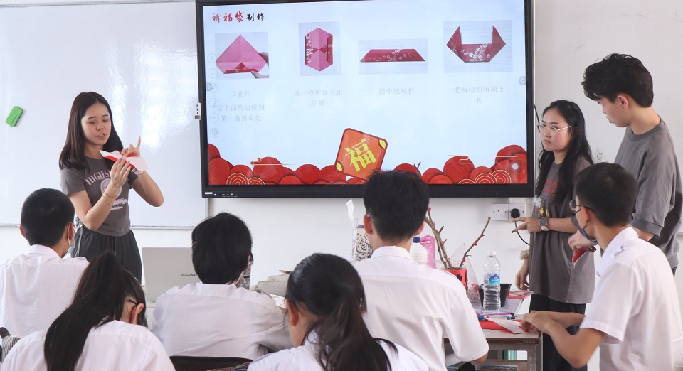 中国华侨大学学生祈福袋折纸教学 2024年2月2日发布 目前正在中国华侨大学深造的本校校友方子恒、蔡嘉进和黄绍峰,趁着农历新年回到母校探访师长外,也偕同华侨大学学生杨欣琳一同到高二文美班教导同学们制作祈福袋,希望育才独中的同学们在龙年福气满满,福星高照! 中国华侨大学宣讲会