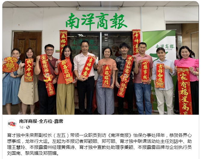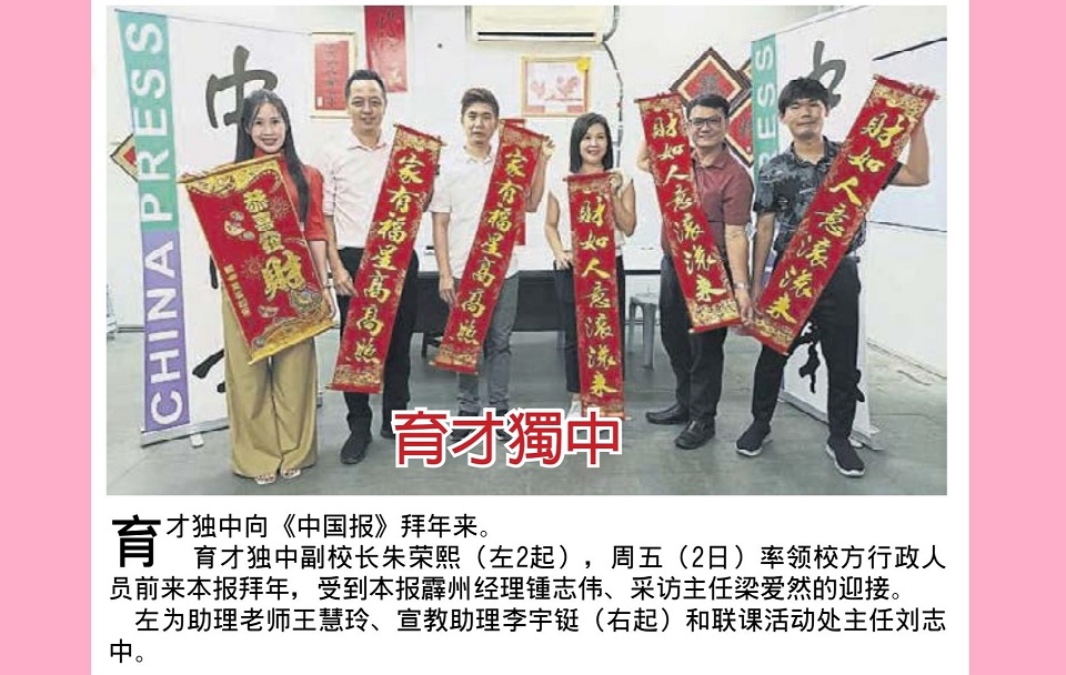拜访《中国报》、《星洲日报》怡保办事处 2024年2月8日发布 配合农历新年,本校朱荣熙副校长于日前偕同联课活动主任刘誌中老师、助理王慧玲老师和宣教处助理李宇铤前往《中国报》和《星洲日报》霹雳州怡保办事处拜个早年,除了感谢报馆报道育才独中的活动外,也借此机会提升与媒体之间的关系。 《南洋日报全方位霹雳》报道:“育才独中到访《南洋商报》怡保办事处拜年“
