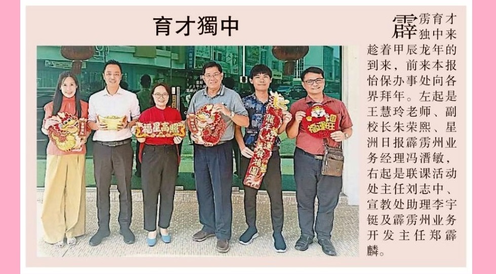 本校文美班学生布置龙年新春装饰 2024年2月8日发布 配合龙年,本校文美班的同学在美术科主任古景遥老师和美术教师叶丝淣老师的指导下,为学校大厅和礼堂舞台布置了充满“龙”元素的新年装饰,祝愿大家龙马精神,龙年行好运! (部分照片由叶丝淣老师提供) 拜访《中国报》、《星洲日报》怡保办事处