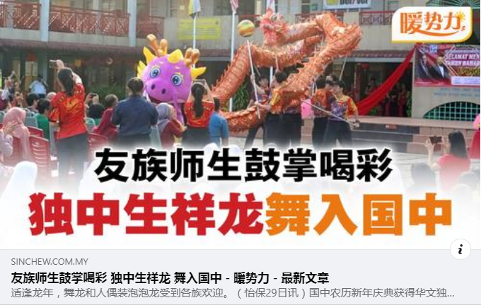 本校龙狮团和舞蹈团于日前在首相打扪选区事务官暨本校董事黄瑞德先生的安排和协调下,由朱荣熙副校长和联课活动助理王慧玲老师带领前往红毛丹国中(SMK TANJUNG RAMBUTAN)进行农历新年文化表演,并被《星洲日报》于全国版“暖势力”一栏中报道。 点击图片浏览全文 联课活动处举办“甲辰年班级新春条幅设计比赛”