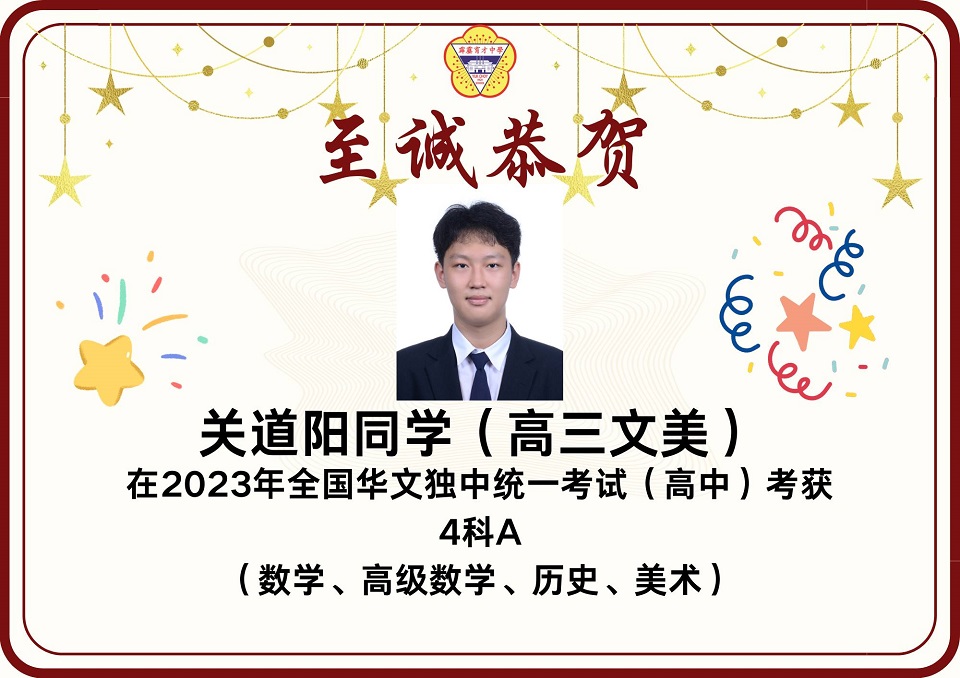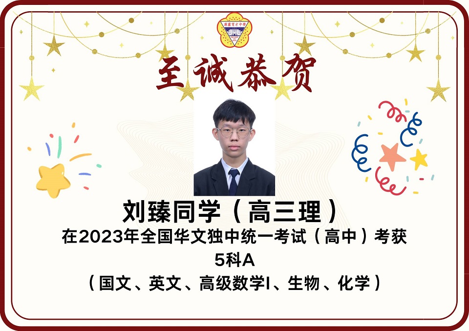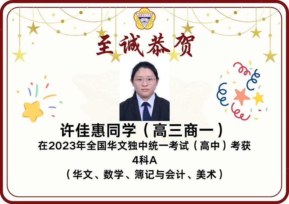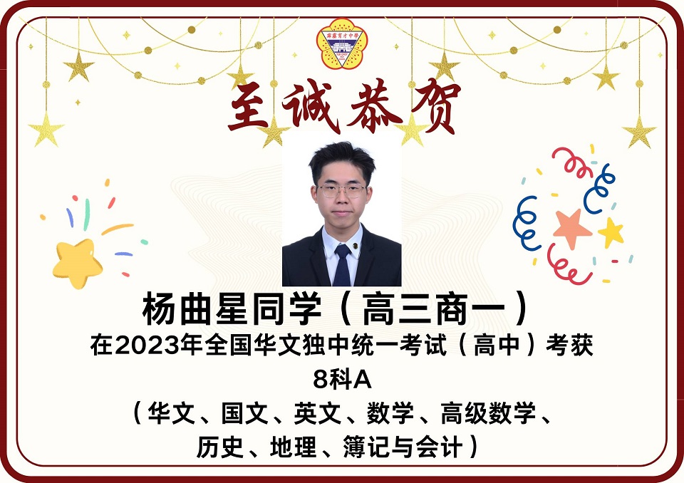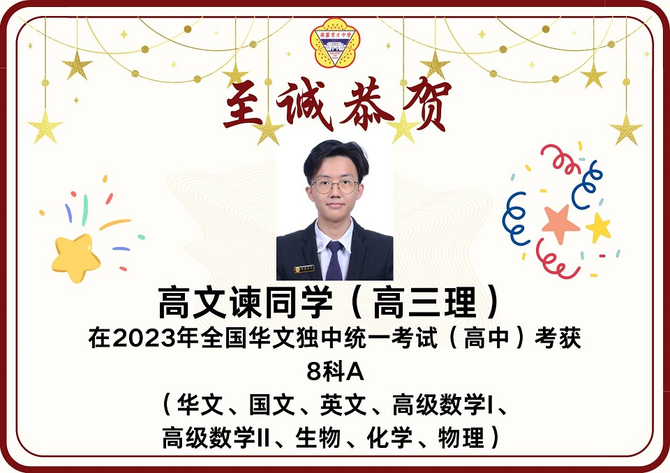 2023年统考成绩放榜 2023年第49届全国独中统一考试(统考)放榜,本校在高中统考方面共有12名考生考获3科A以上的成绩,其中2人考获8科全A优异成绩。 本校高中共197名考生,高中组的总及格率为85.93%。报考科目共18项,其中13项的及格率皆在80%以上。 高中考获8A成绩的学生为高文谏、杨曲星;考获5A绩的学生为刘臻、张炜琳;考获4A成绩的学生为关道阳、许佳惠、林俊宏、杨邦隽;考获3A成绩的学生为杨家豪、朱凯翔、廖于升、杜浚琛。 在初中统考方面,本校共有8名考生考获3科A以上,其中1人考获6A的佳绩。 本校初中共165名考生,总及格率为89.39%。8个报考科目的各科及格率介于82%至99%之间,维持与去年一样的水平。初中考获6A成绩的学生为蔡镓情;考获5A成绩的学生为范文康、贝玮棋;考获4A成绩的学生为黄拔政、施傲云;考获3A成绩的学生为邹宇轩、陈鸿策和黄宇捷。 考获8科全A的同学高文谏表示,知晓成绩的那一刻,心中的担忧和焦虑一并消去,只留下喜悦和激动的情绪。为应付统考,数不胜数的留堂和自习起了至关重要的作用。如今回想起这忙前忙后的日子,除了感慨时光的流逝,更多的是感激身边的人。 “愿我们能够各自努力,相约在顶峰,未来可期。” 另一名同样考获8A的同学杨曲星表示,三年的高中生活确实不易,自己更在高三统考这年经历了求学的最低谷期,在学习路上面对许多阻碍和质疑。他感谢父母在他最低谷时期的陪伴,也感谢学校的一些老师和朋友们的支持,还有感谢在学校面对质疑和阻碍时所受到的磨炼,使他成为了真正的自己。 他勉励学弟妹们表示,成绩不是一切,在学习过程中更要发现生活的意义,不要在乎别人的眼光,更重要的是要活出自我,只要开开心心、平平淡淡过好每一天就好了。 考获6A成绩的同学蔡镓情表示,在看到成绩的那一刻,悬着的心情终于放下,并且在同学们的欢呼声、掌声及祝福声中回过神来,也为自己考到好成绩感到开心。她说,虽然未达到设定的目标,但已感到满足,很感谢老师们的教导,以及朋友们在无数个夜晚的陪伴和督促。 考获5A成绩的同学贝纬棋表示,长久的努力终于有了回报。他说,当时为了准备统考,几乎每天都在不停地复习,放学回家便不停地做数理统考题,每逢周末则背历史、地理和其他科目,就这样日复一日,不放过复习的任何一秒钟,才有今天的成绩。他说,天下无难事,只要肯去做就离成功不远。 另一名考获5A的同学范文康表示,非常感谢老师们的教导,尤其是数学和国文老师愿意在课堂以外的时间为他解惑,而且通过这次统考成绩让他相信只要愿意努力上进,便一定会苦尽甘来,距离自己所追求的理想越近。 图书馆开始新学年的借书服务