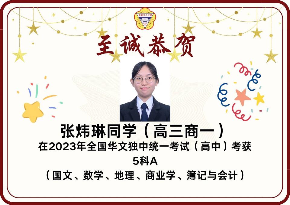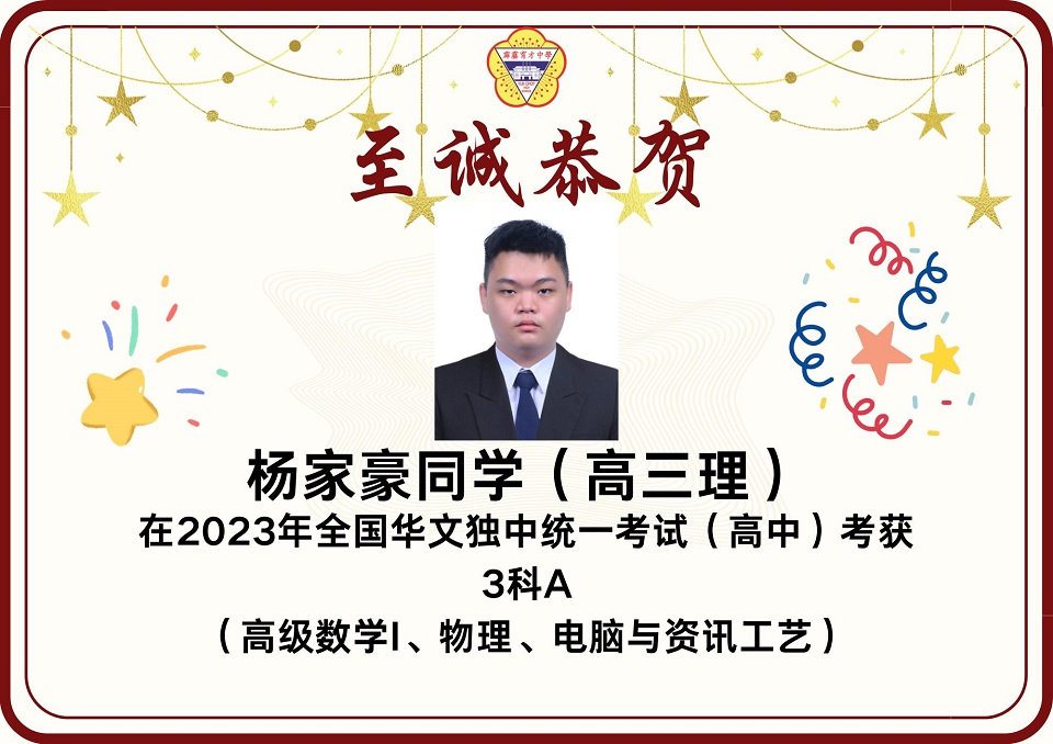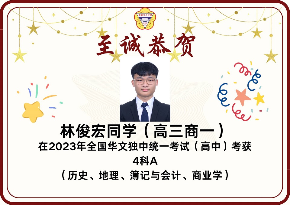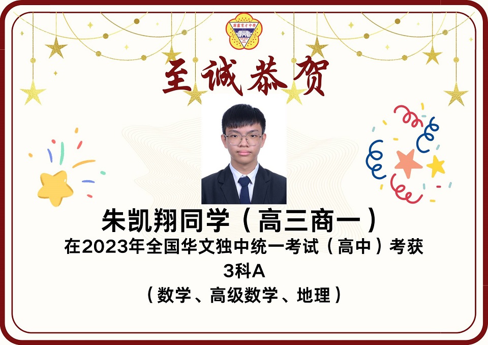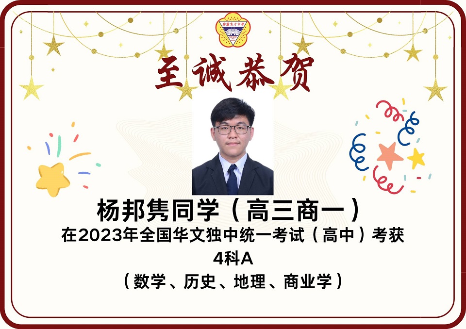 2023年统考成绩放榜 2023年第49届全国独中统一考试(统考)放榜,本校在高中统考方面共有12名考生考获3科A以上的成绩,其中2人考获8科全A优异成绩。 本校高中共197名考生,高中组的总及格率为85.93%。报考科目共18项,其中13项的及格率皆在80%以上。 高中考获8A成绩的学生为高文谏、杨曲星;考获5A绩的学生为刘臻、张炜琳;考获4A成绩的学生为关道阳、许佳惠、林俊宏、杨邦隽;考获3A成绩的学生为杨家豪、朱凯翔、廖于升、杜浚琛。 在初中统考方面,本校共有8名考生考获3科A以上,其中1人考获6A的佳绩。 本校初中共165名考生,总及格率为89.39%。8个报考科目的各科及格率介于82%至99%之间,维持与去年一样的水平。初中考获6A成绩的学生为蔡镓情;考获5A成绩的学生为范文康、贝玮棋;考获4A成绩的学生为黄拔政、施傲云;考获3A成绩的学生为邹宇轩、陈鸿策和黄宇捷。 考获8科全A的同学高文谏表示,知晓成绩的那一刻,心中的担忧和焦虑一并消去,只留下喜悦和激动的情绪。为应付统考,数不胜数的留堂和自习起了至关重要的作用。如今回想起这忙前忙后的日子,除了感慨时光的流逝,更多的是感激身边的人。 “愿我们能够各自努力,相约在顶峰,未来可期。” 另一名同样考获8A的同学杨曲星表示,三年的高中生活确实不易,自己更在高三统考这年经历了求学的最低谷期,在学习路上面对许多阻碍和质疑。他感谢父母在他最低谷时期的陪伴,也感谢学校的一些老师和朋友们的支持,还有感谢在学校面对质疑和阻碍时所受到的磨炼,使他成为了真正的自己。 他勉励学弟妹们表示,成绩不是一切,在学习过程中更要发现生活的意义,不要在乎别人的眼光,更重要的是要活出自我,只要开开心心、平平淡淡过好每一天就好了。 考获6A成绩的同学蔡镓情表示,在看到成绩的那一刻,悬着的心情终于放下,并且在同学们的欢呼声、掌声及祝福声中回过神来,也为自己考到好成绩感到开心。她说,虽然未达到设定的目标,但已感到满足,很感谢老师们的教导,以及朋友们在无数个夜晚的陪伴和督促。 考获5A成绩的同学贝纬棋表示,长久的努力终于有了回报。他说,当时为了准备统考,几乎每天都在不停地复习,放学回家便不停地做数理统考题,每逢周末则背历史、地理和其他科目,就这样日复一日,不放过复习的任何一秒钟,才有今天的成绩。他说,天下无难事,只要肯去做就离成功不远。 另一名考获5A的同学范文康表示,非常感谢老师们的教导,尤其是数学和国文老师愿意在课堂以外的时间为他解惑,而且通过这次统考成绩让他相信只要愿意努力上进,便一定会苦尽甘来,距离自己所追求的理想越近。 图书馆开始新学年的借书服务
