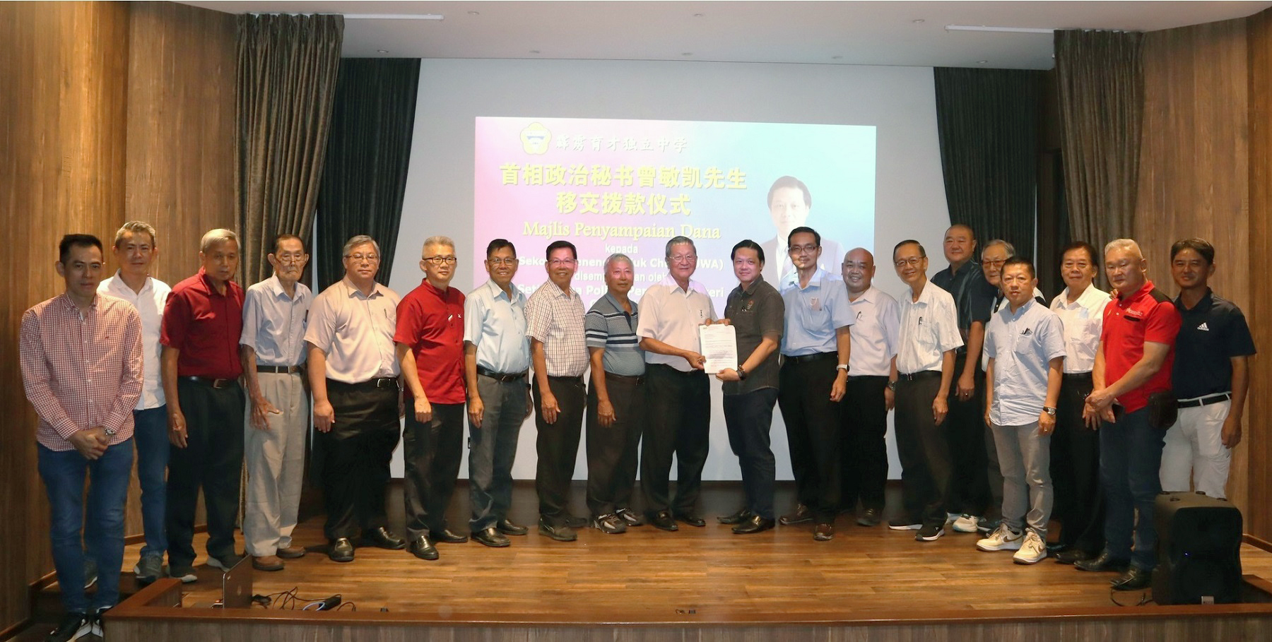 感谢首相署特别拨款50万令吉 2024年1月8日发布 踏入新的一年,万象更新之际,本校喜获首相署特别拨款50万令吉,以更新礼堂的冷气设备。 首相政治秘书曾敏凯先生于日前联同打扪区国会议员特别事务官兼本校董事黄瑞德先生亲临本校移交有关特别拨款,并且在移交特别拨款仪式活动上致词表示,华文教育筹款办学不易,所谓前人种树,后人乘凉,所以受惠的同学们要懂得珍惜和饮水思源。既然比前人享有更好的教育环境,便要加倍努力呈现出比前人杰出的表现,才不枉费前辈们的无私奉献精神。 他也表示,希望各个学校在发展的过程中,不要只限于硬体设备的发展,应该注重发展学校的内涵,提升教育质量,培养拥有核心知识和能力的学生。我国需要多元化、高素质的专业人才来带领国家向繁荣昌盛迈进,而学校教育则扮演着重要的角色。 本校董事长拿督吴国芳致词时感谢曾敏凯先生以及黄瑞德董事,因为在他们的协助下让本校董事会的征求意愿成功传达给首相拿督斯里安华,并且获得这项特别拨款。 董事长表示,礼堂的冷气大概是在2005年安装,而这是当时拱桥一家名为MABUCHI MOTOR的工厂曾使用过的二手冷气设备。由于该工厂准备搬迁,所以时任董事会财政黄亚珠先生和时任董事会发展主任许显儒先生透过在该公司担任董事的育才校友黄进富先生充当沟通桥梁,向工厂的台湾老板征求这批冷气设备。由于礼堂的冷气设备使用了将近20年,加上之前工厂所使用的年限,可能已经有几十年。 他表示,近几年礼堂冷气设备经常出现损坏的情况,耗损了不少维修费,所以董事会决定安装新冷气,而这需要耗资超过70万令吉,所以校方才会向政府申请拨款。 仪式活动上,他代表董事会在出席董事与黎镇光校长陪同下接领拨款,并回赠对方水果礼篮和锦旗。出席董事包括署理董事长黄亚珠、董事会总务黄伟生、副总务张文义、张玉和;财政刘子真、查账卢天德、董事吴俊隆、刘子清、麦翔、陈细祥、黄成朱、岑卓能、陈宝雄、陈志胜;委任董事江健龙、黄健和等。 2024甲辰年新春采青预约