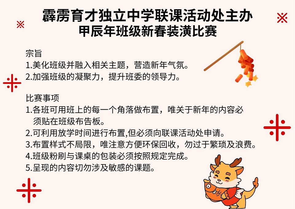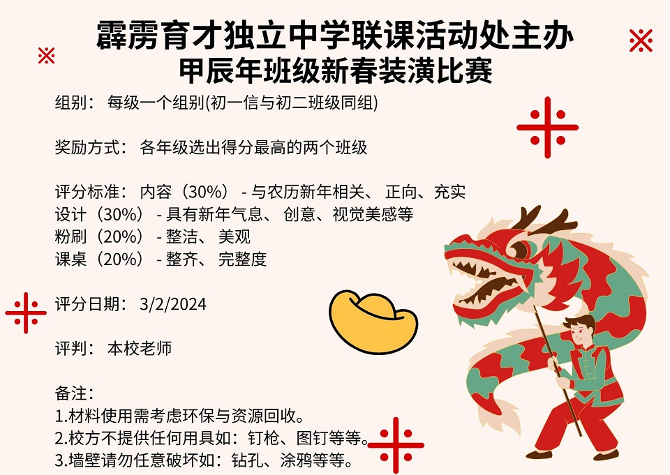 联课活动处举办“班级新春装潢比赛”和“班级新春条幅设计比赛” 2024年1月12日发布 配合农历新年,本校联课活动处举办“班级新春装潢比赛”和“班级新春条幅设计比赛”。让各班的同学们发挥创意,把课室布置得充满新年气氛。 感谢首相署特别拨款50万令吉